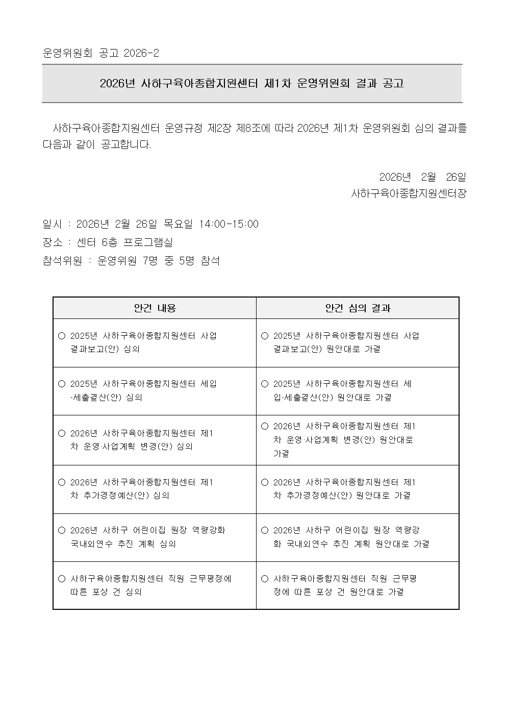 2026년 사하구육아종합지원센터 제1차 운영위원회 결과 공고