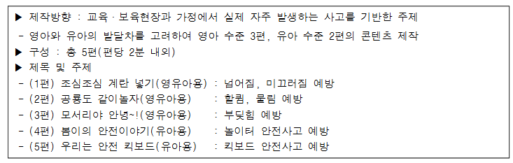 교육부에서 영유아 안전사고 예방을 위하여 어린이집 및 학부모가 활요할 수 있는 에니메이션을