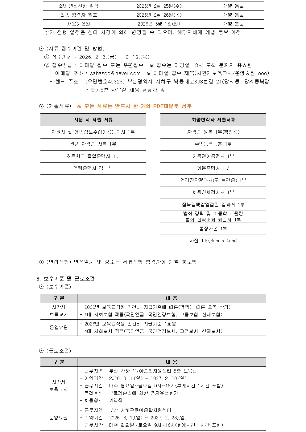 [사하구육아종합지원센터] 2026년 시간제보육교사, 운영요원 채용 공고