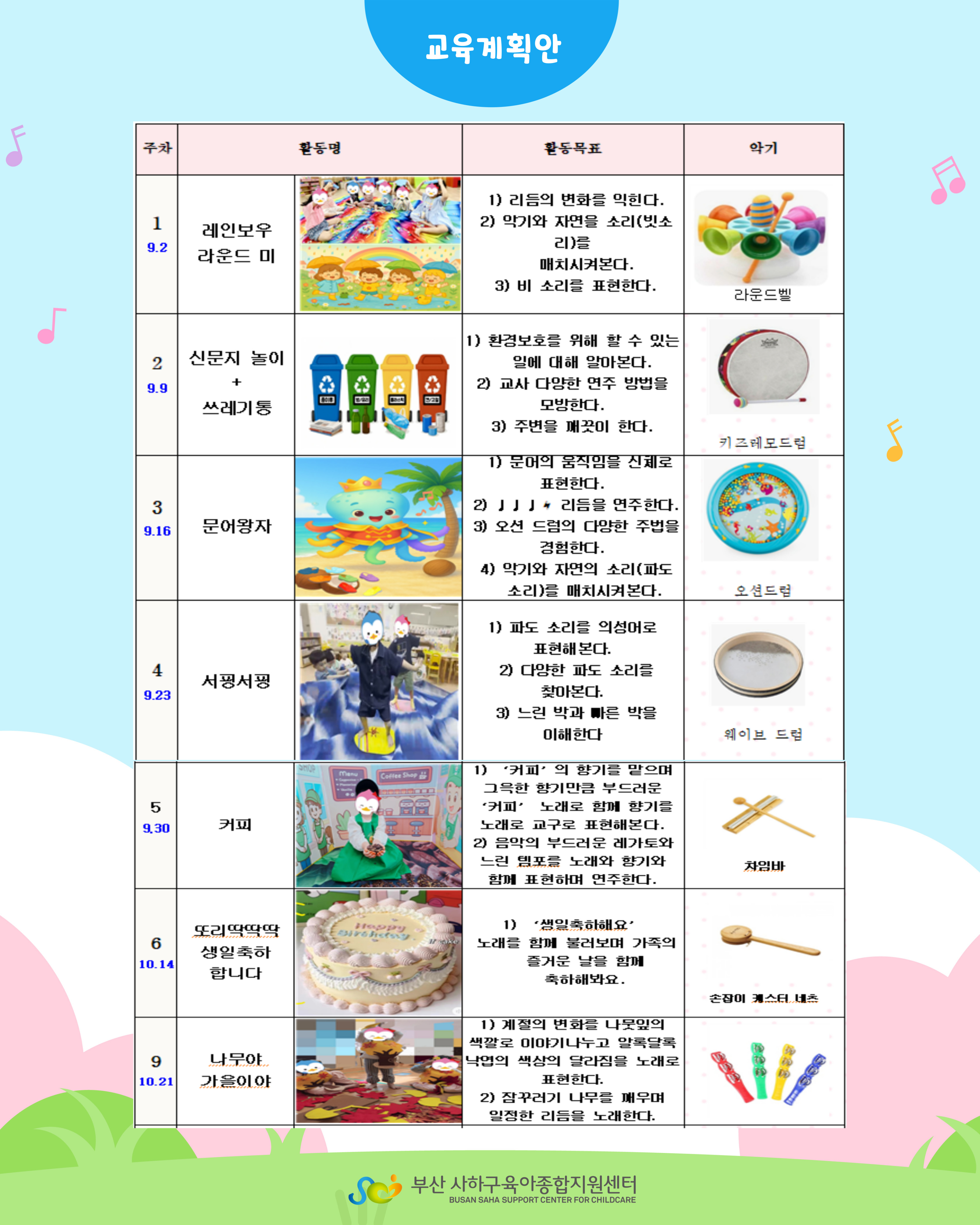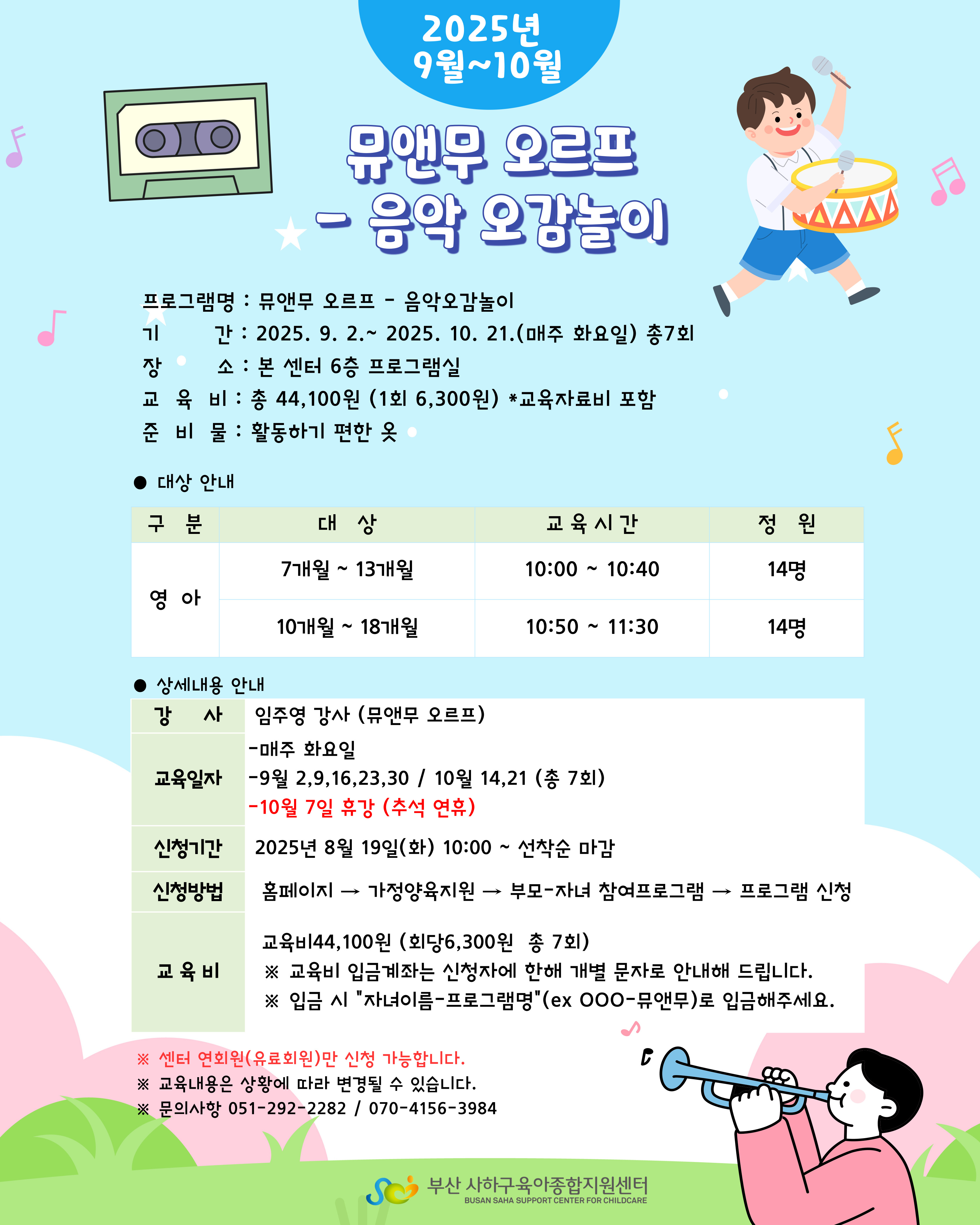 [사하구육아종합지원센터] 2025년 가을학기 - 뮤앤무 오르프 (음악 오감놀이) 신청 안내