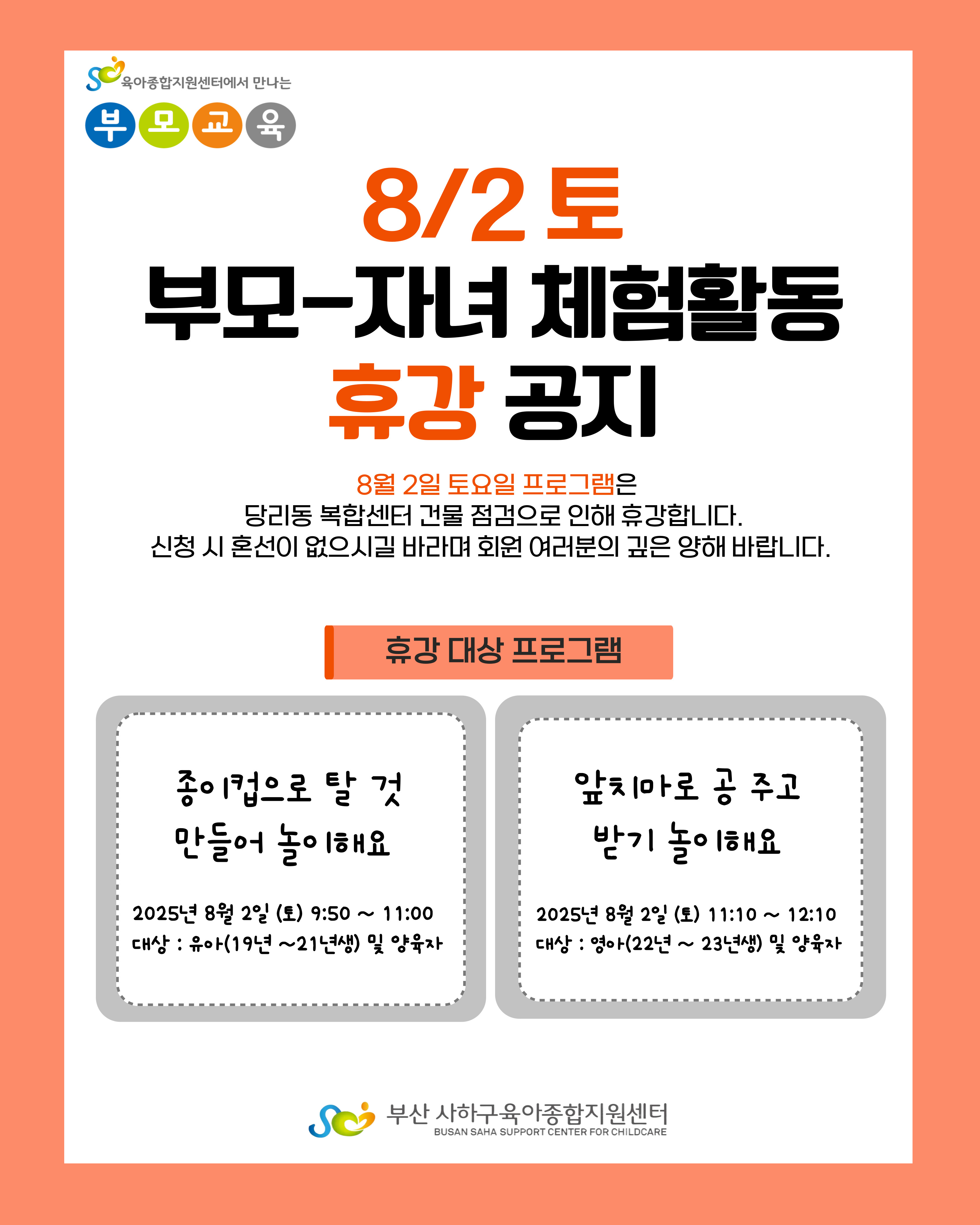 [사하구육아종합지원센터] 8/2 (토) 부모-자녀 체험활동 휴강 안내