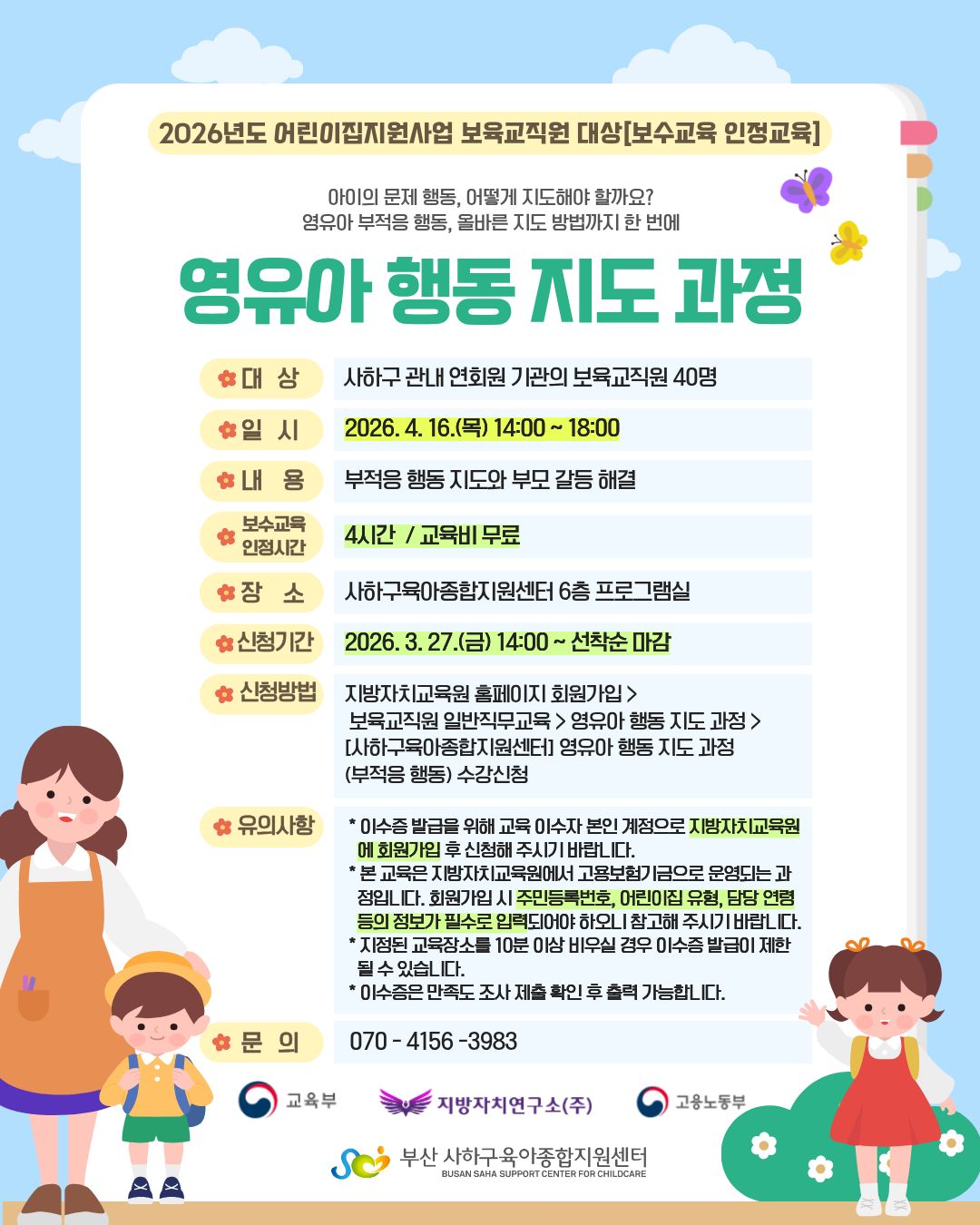 [사하구육아종합지원센터] 「보수교육 인정-영유아 행동지도 과정」 신청 안내