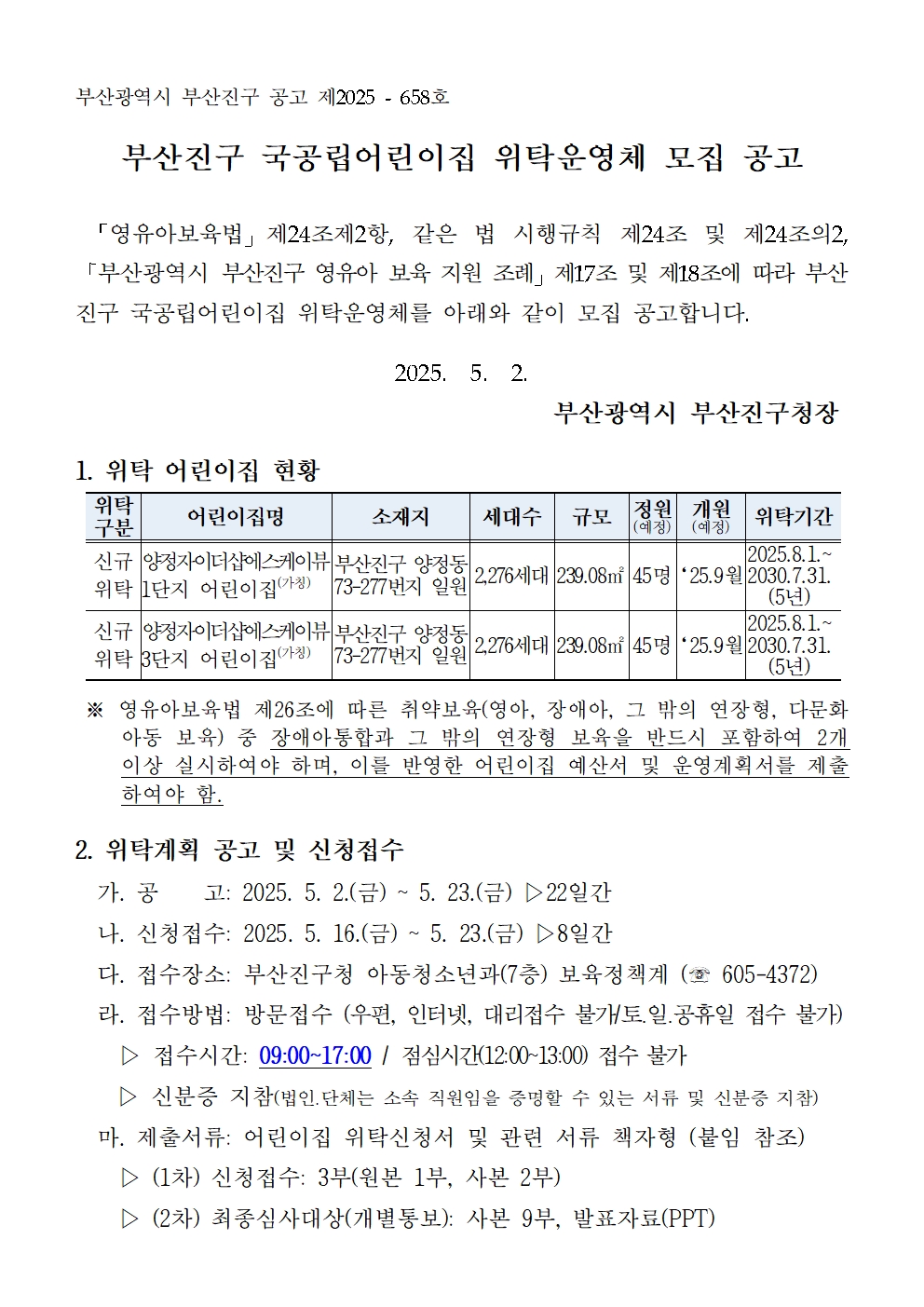 [붙임1]부산진구 국공립어린이집 위탁운영체 모집공고문(양정자이더샵에스케이뷰 1단지 3단지).hwp