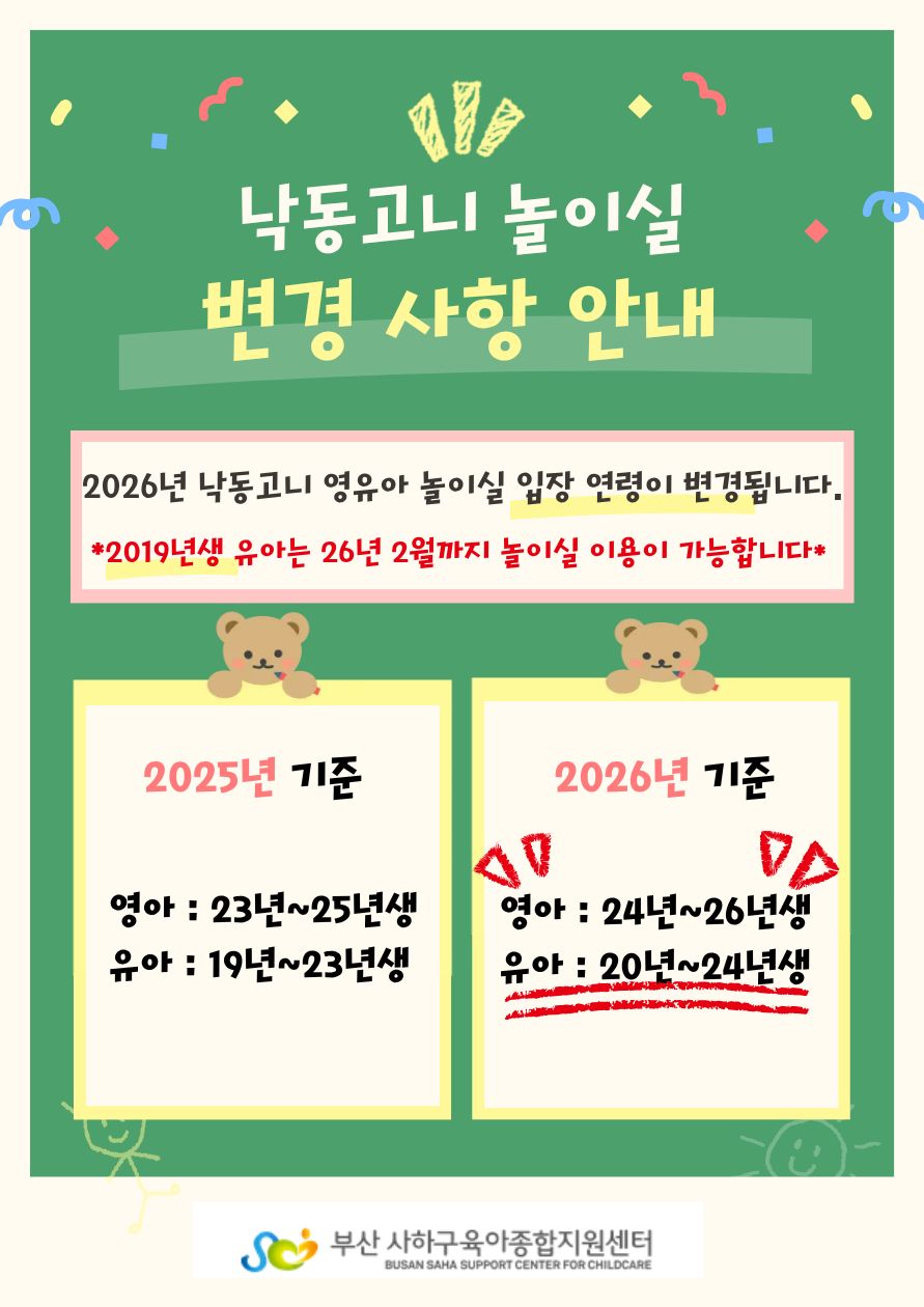 2026년 낙동고니 영유아 놀이실 입장 년생이 변경됩니다.