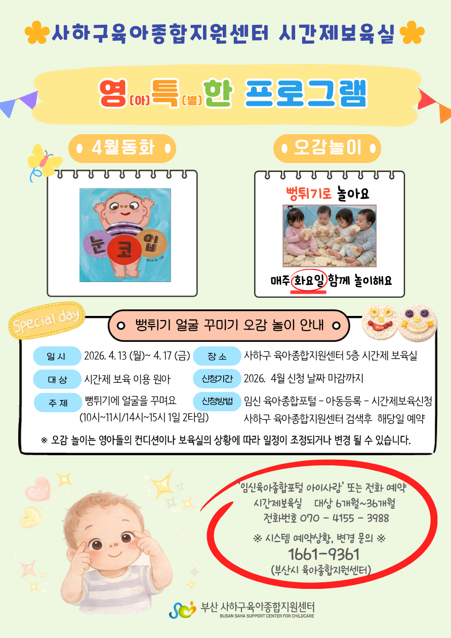 1. 임신육아종합포털→아이사랑 로그인 아동등록→시간제 보육 신청→사하구 육아종합지원센터 검색후 해당일 예약