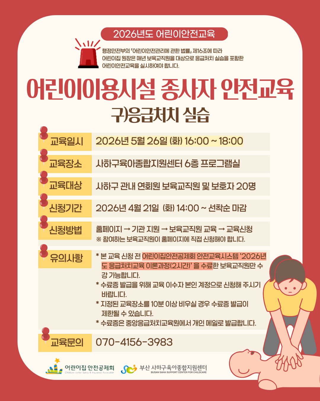 * 본 교육 신청 전 어린이집안전공제회 안전교육시스템 ‘2026년도 응급처치교육 이론과정(2시간)’ 을 수료한 보육교직원만 수강 가능합니다.