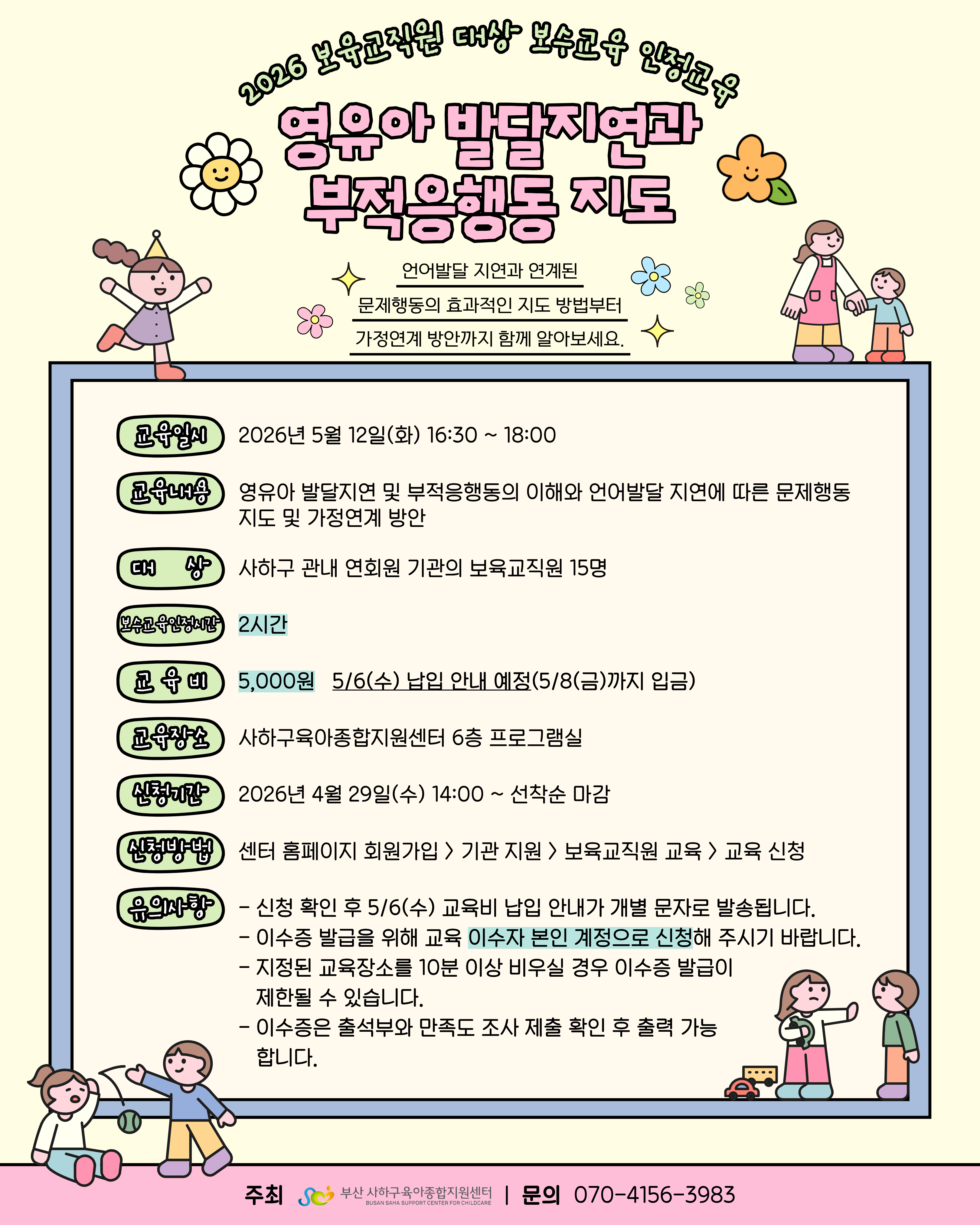 [사하구육아종합지원센터] 보육교직원 대상 「영유아 발달지연과 부적응행동 지도」 교육 신청 안내