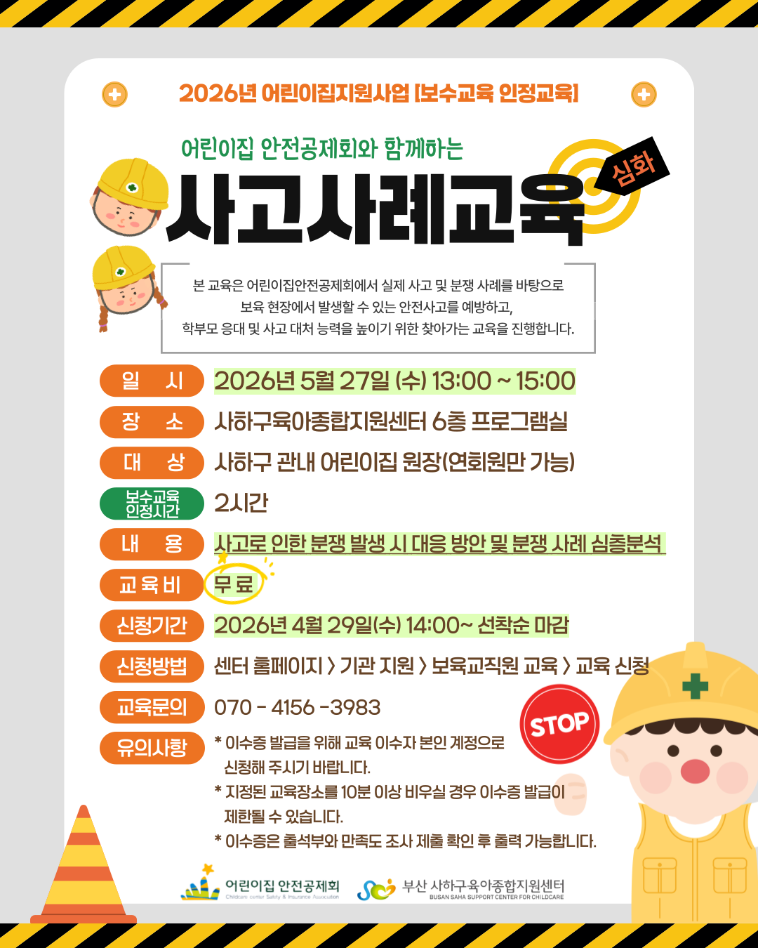 [사하구육아종합지원센터] 원장 대상 「어린이집 안전공제회와 함께하는 사고사례교육-심화」 교육 신청 안내
