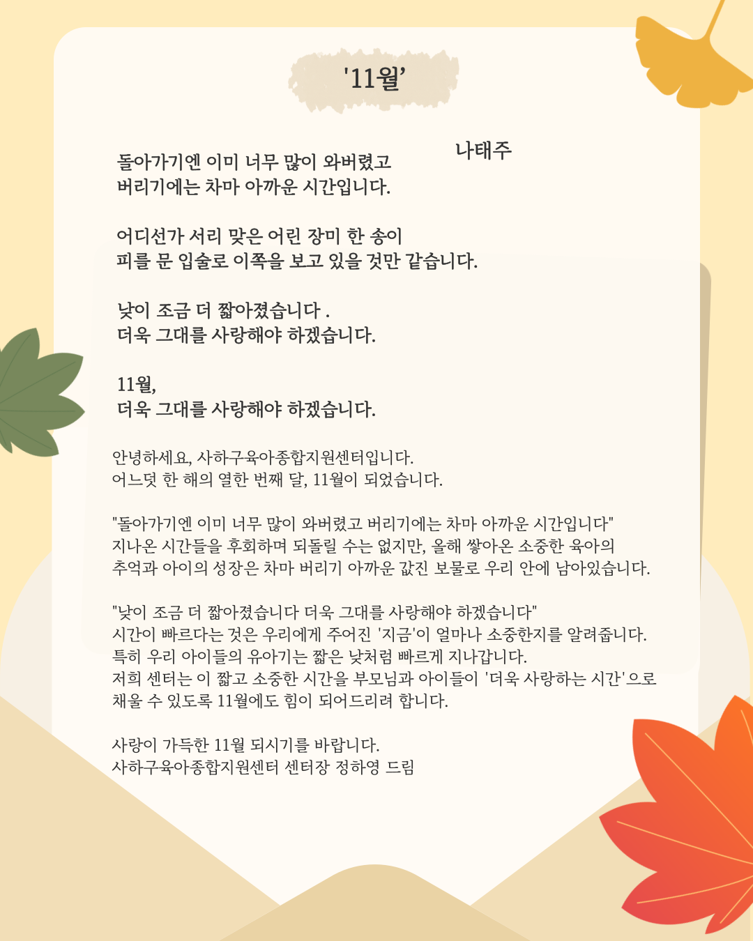 가을의 끝자락에서 11월 뉴스레터를 전해드립니다.