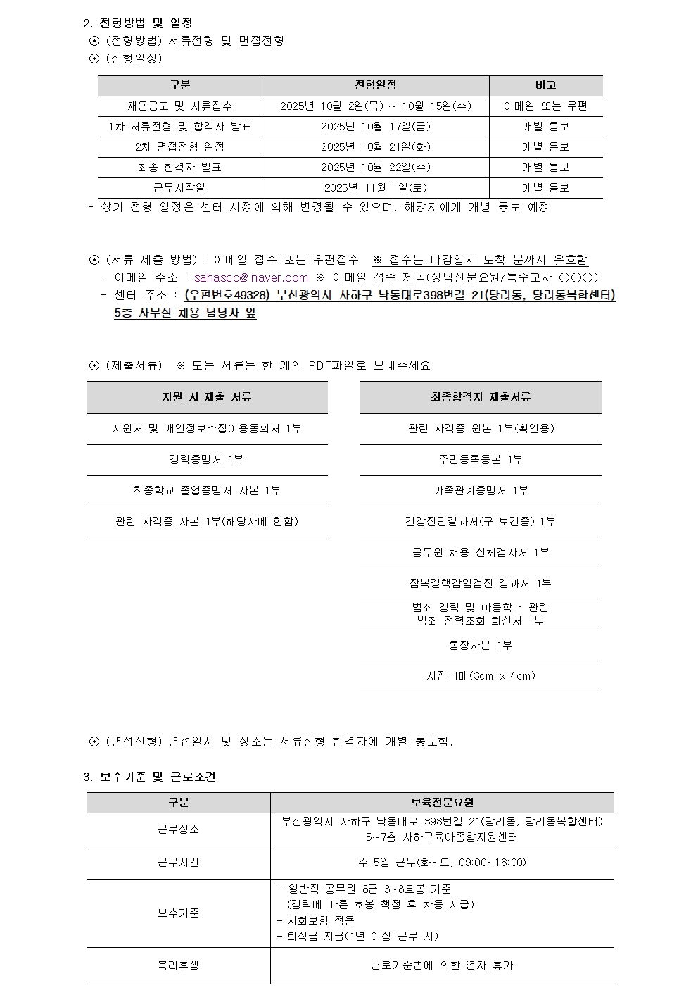 [사하구육아종합지원센터] 2025년 사하구육아종합지원센터 직원(상담전문요원, 특수교사) 채용 공고