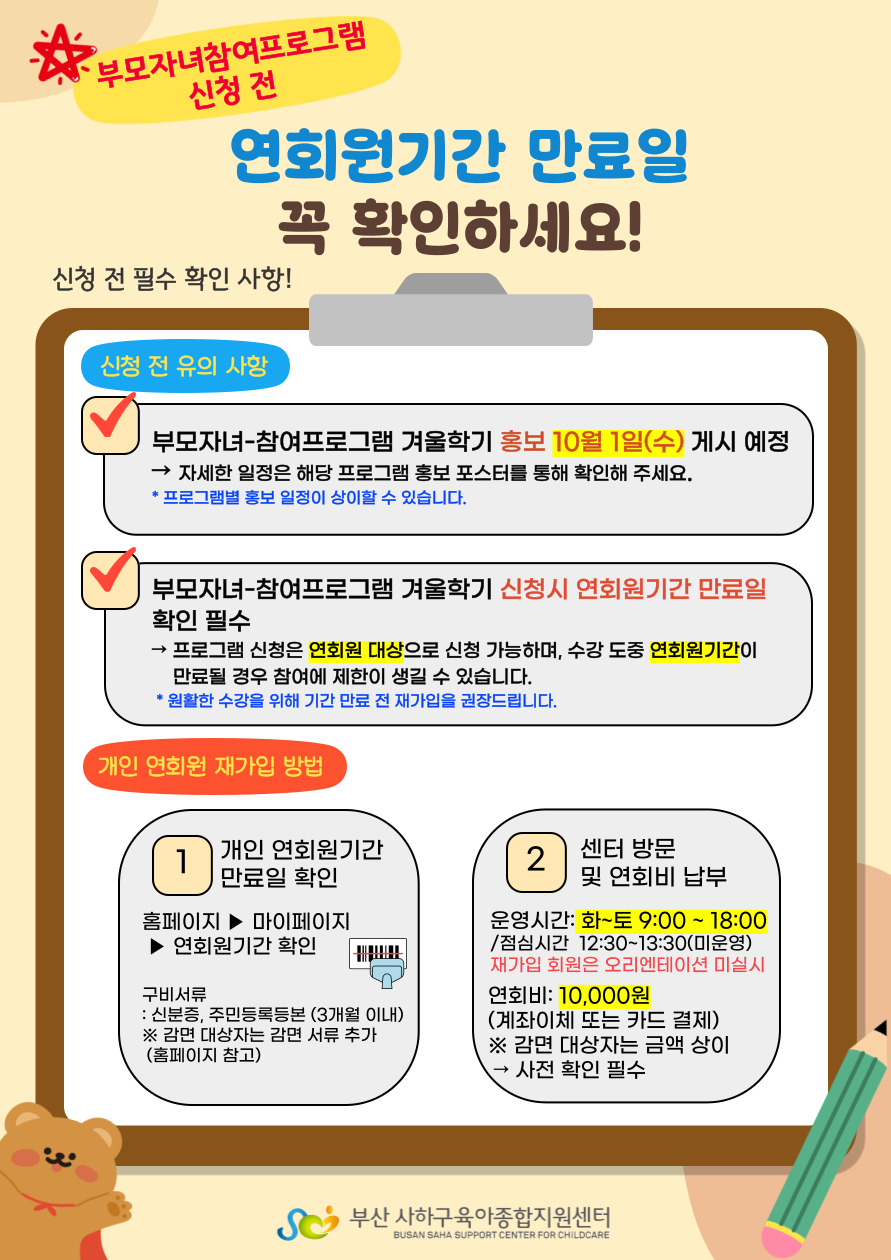 [사하구육아종합지원센터]겨울학기 부모-자녀 참여프로그램 신청 전, 연회원기간 만료일을 꼭 확인하세요~!