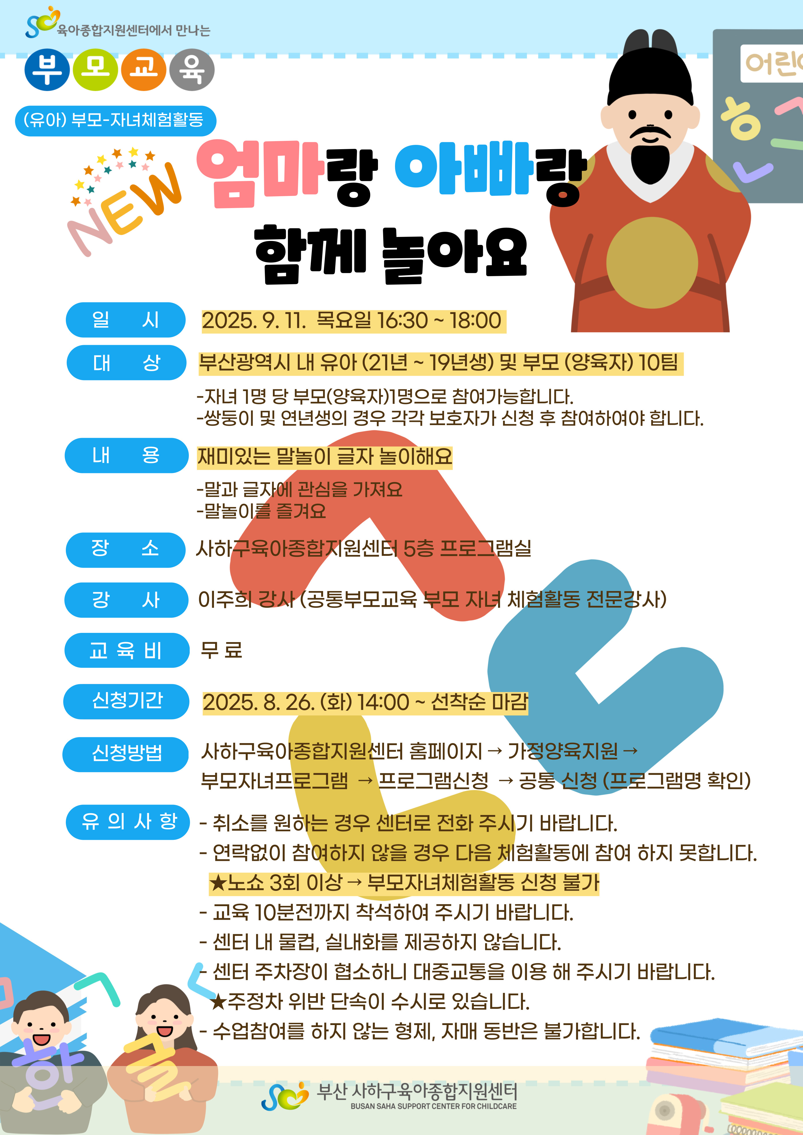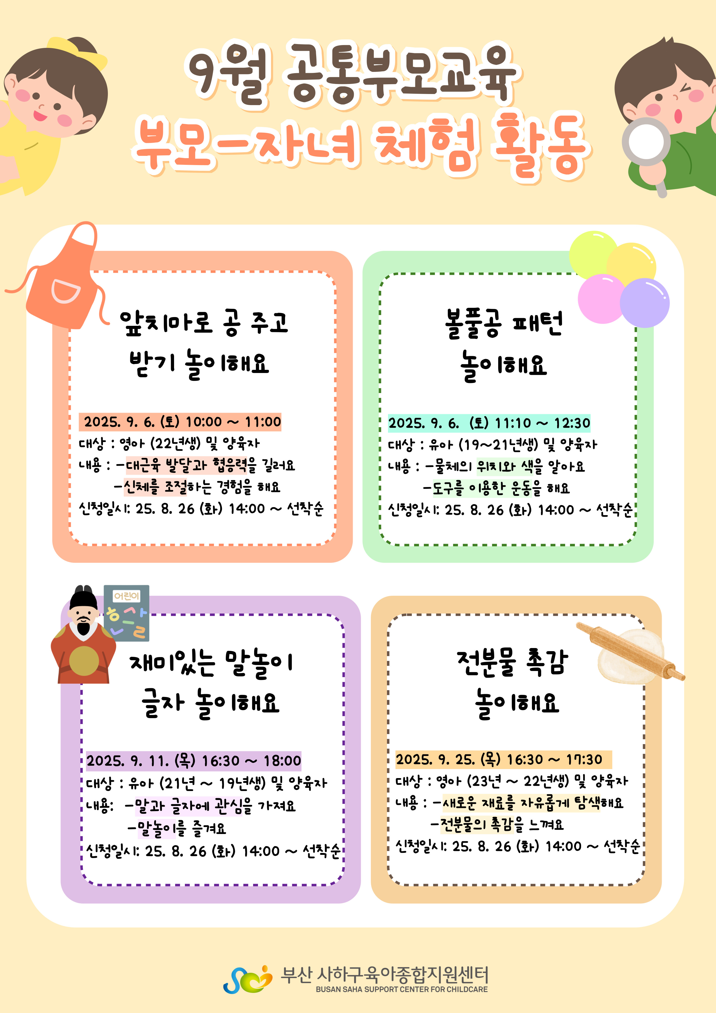 [사하구육아종합지원센터] 9월 공통부모교육 부모-자녀 체험 활동 안내