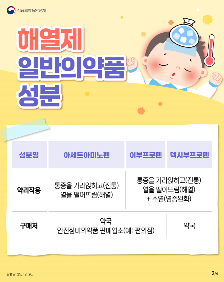 의사의 처방 없이 구매할 수 있는 일반의약품 해열제 성분에는 ‘아세트아미노펜, 이부프로펜, 덱시부프로펜’이 있다. ‘아세트아미노펜’과 ‘이부프로펜’은 약국 또는 안전상비의약품 판매업소(편의점 등)에서 구매할 수 있고, ‘덱시부프로펜’은 약국에서만 구매할 수 있다.