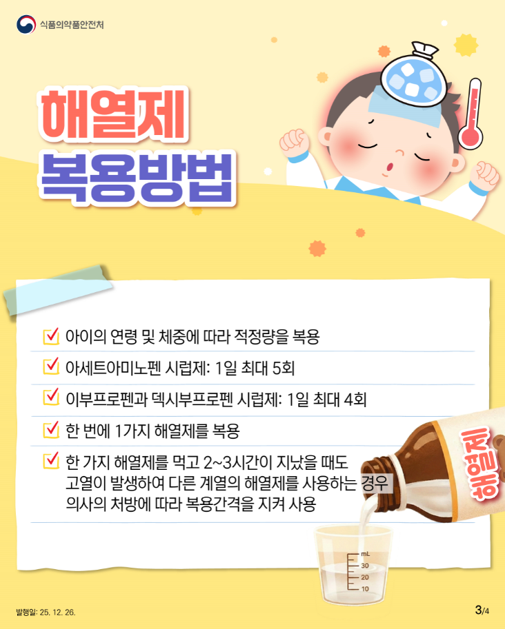 소아 해열제에는 정제 및 시럽제가 있으며, 소아가 많이 복용하는 시럽제의 경우 아세트아미노펜 시럽제는 1회 10~15mg/kg을 4~6시간 간격으로 복용하고 1일 최대 5회를 넘지 않도록 한다. 이부프로펜 시럽제는 1회 5~10mg/kg, 덱시부프로펜 시럽제는 1회 5~7mg/kg을 6~8시간 간격으로 1일 최대 4회까지 복용할 수 있다.