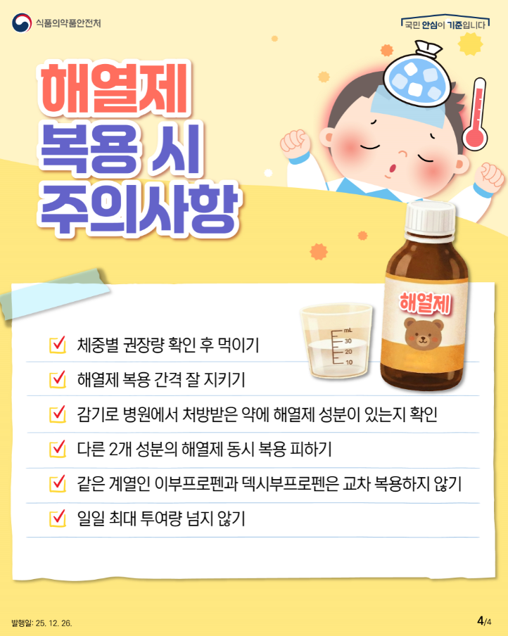 해열제를 복용하며 종합감기약이나 병원에서 처방받은 약을 같이 먹는 경우 해열제 성분을 중복하여 복용할 수 있으므로 반드시 의?약사에게 처방약 등에 해열제 성분이 포함되어 있는지 확인해야 한다.
