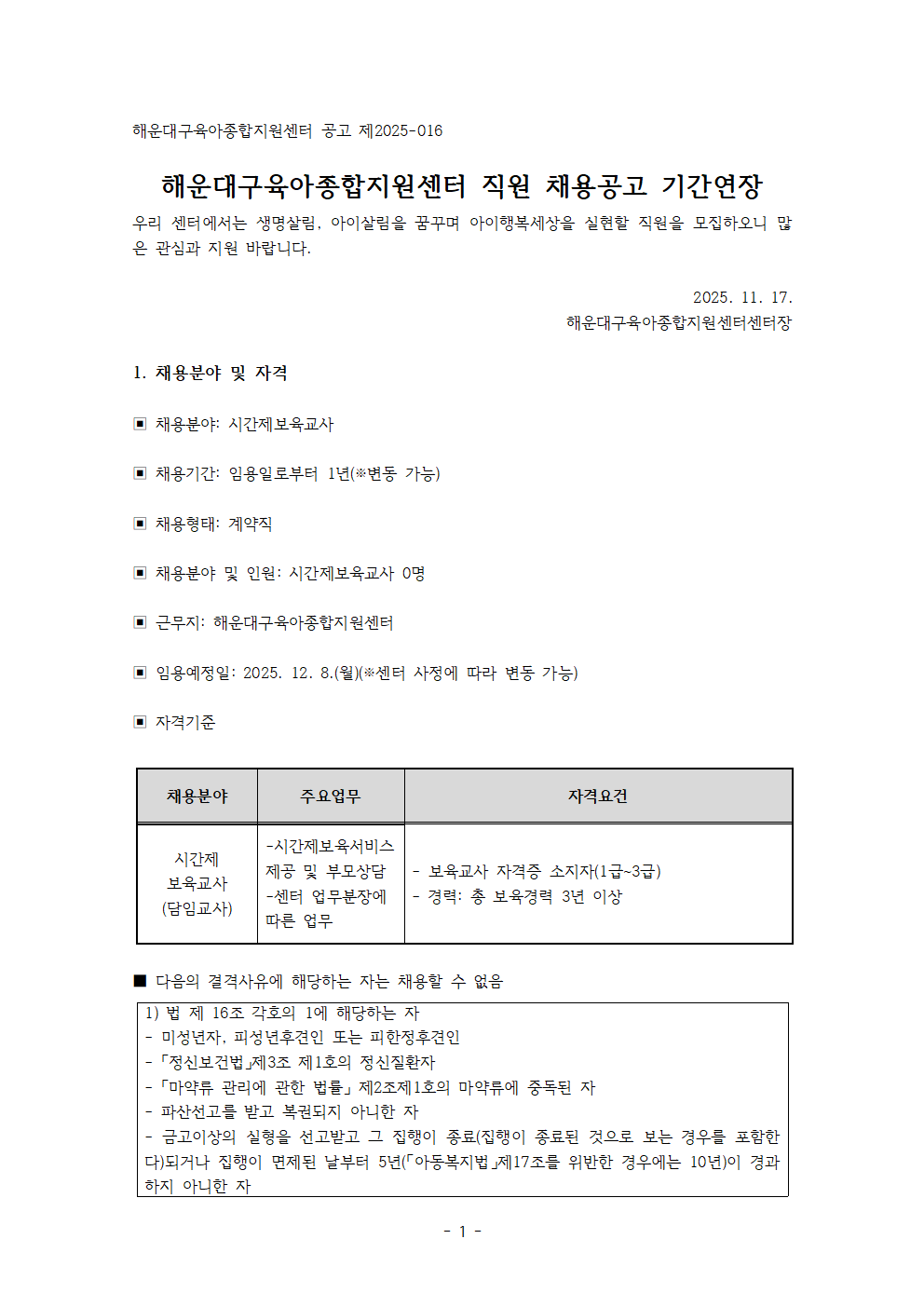 [해운대구육아종합지원센터]직원 채용공고 기간 연장(시간제보육교사)