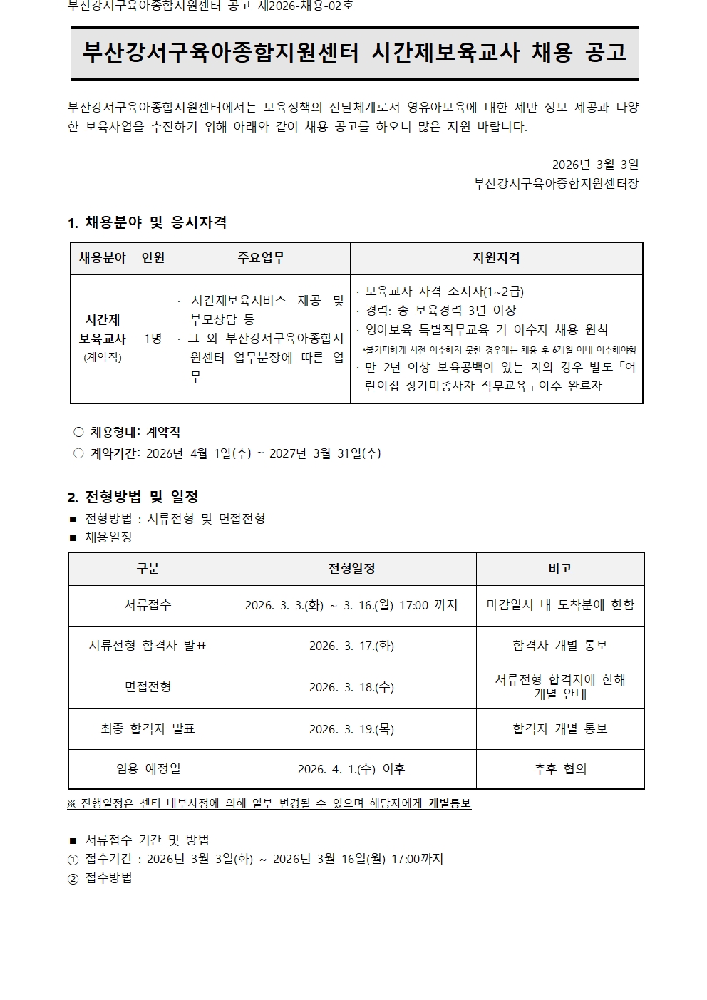 붙임 1_ 부산강서구육아종합지원센터 시간제보육교사 채용 공고문.hwp