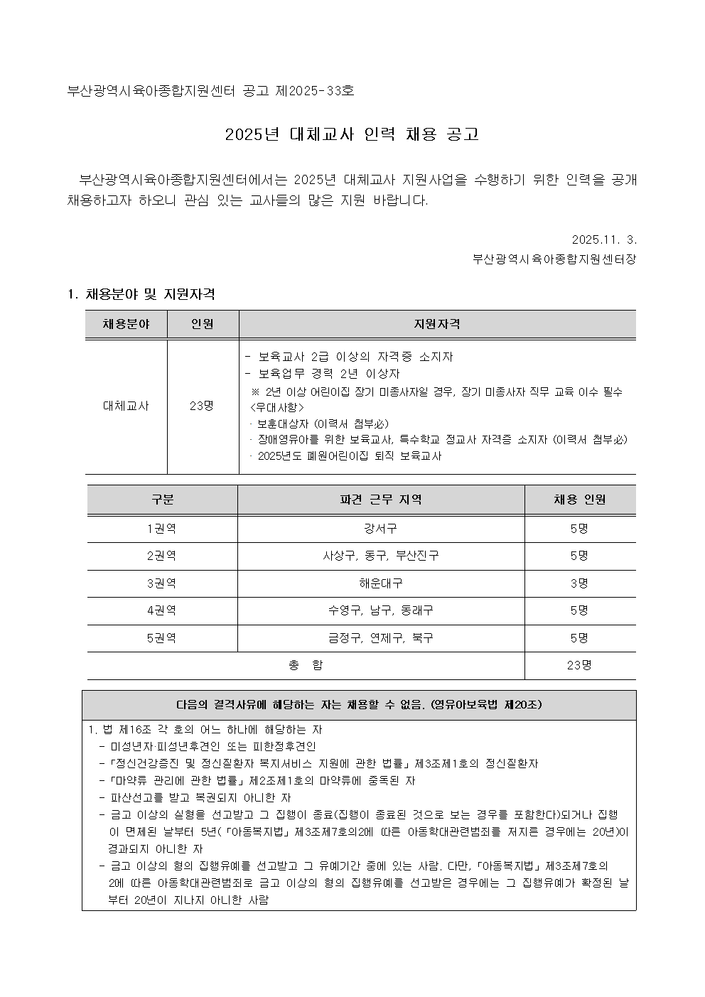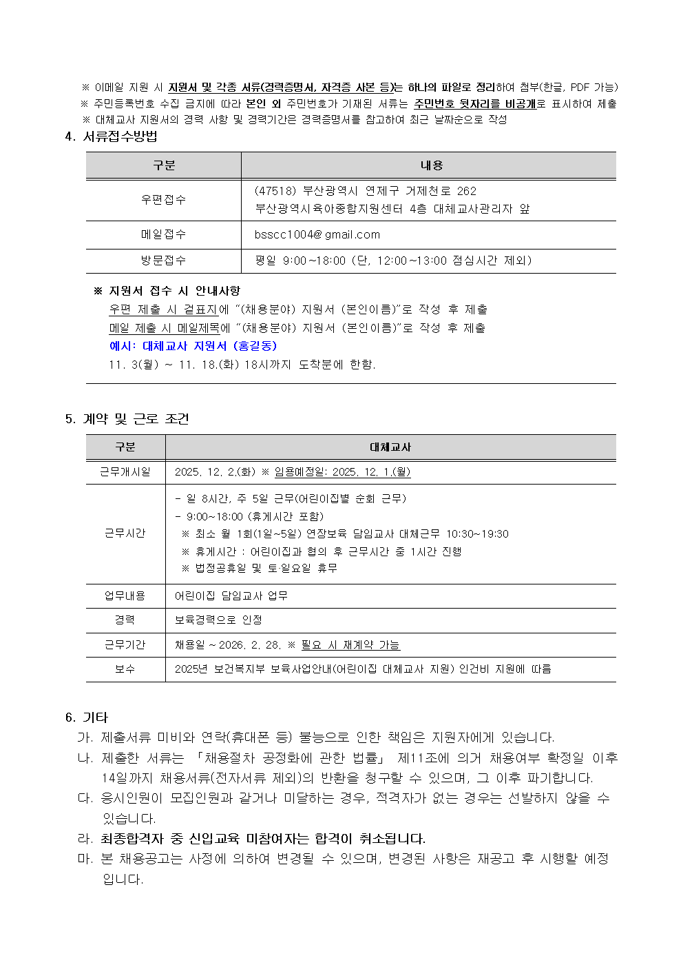 [부산광역시육아종합지원센터] 2025년 대체교사 인력 채용 공고