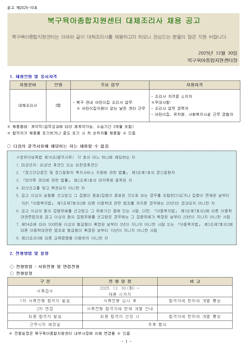 [북구육아종합지원센터] 대체조리사 채용 공고
