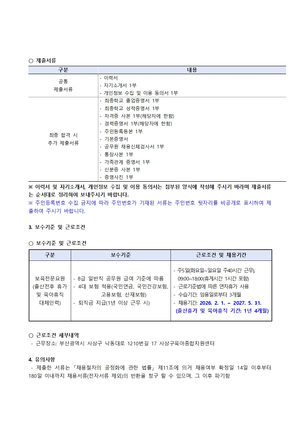 [사상구육아종합지원센터] 보육전문요원(출산전후 휴가 및 육아휴직 대체인력) 채용 공고