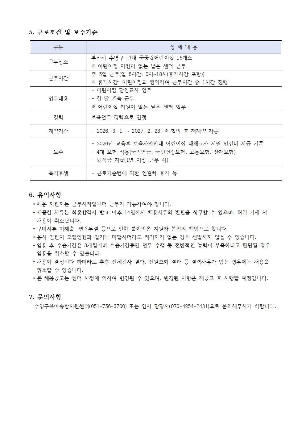 [수영구육아종합지원센터] 국공립어린이집 종일제 대체교사 채용 공고