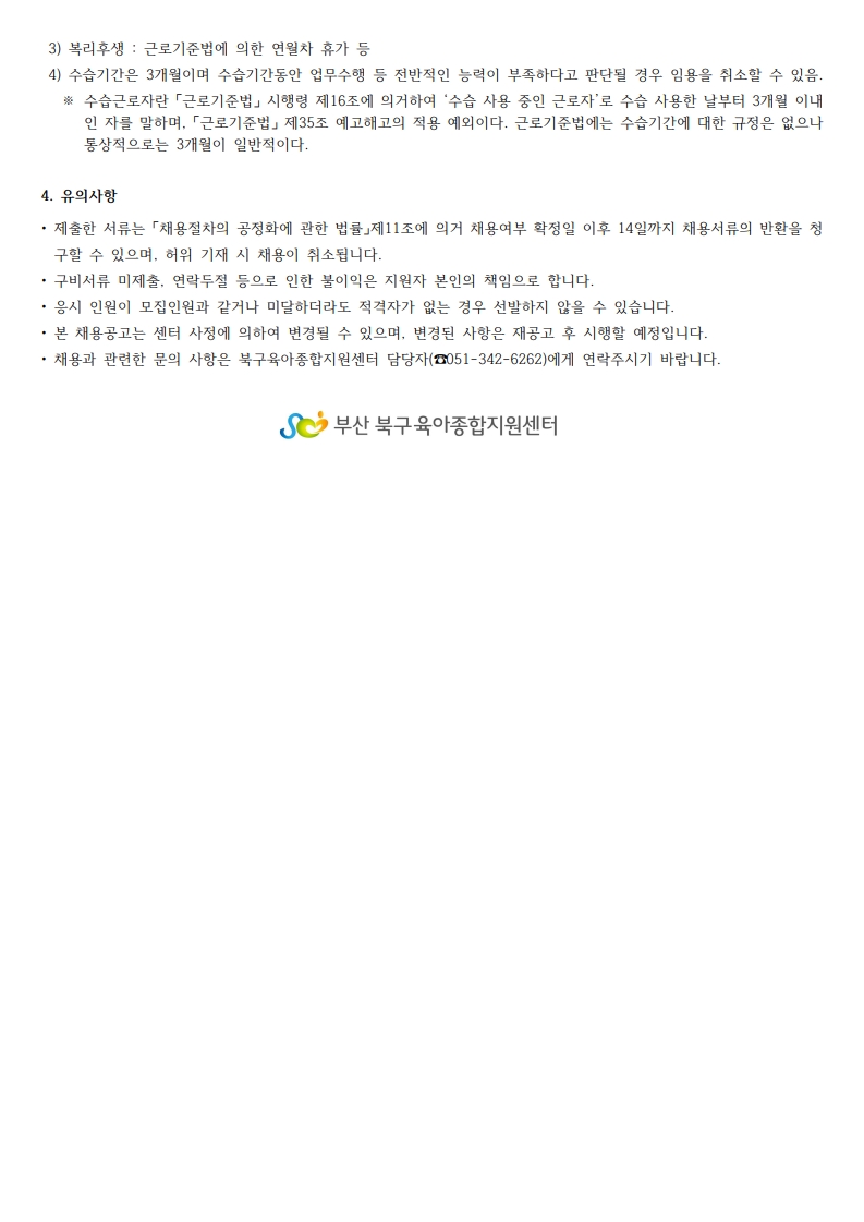 [부산북육아종합지원센터] 시간제보육교사, 운영요원 채용 변경 공고