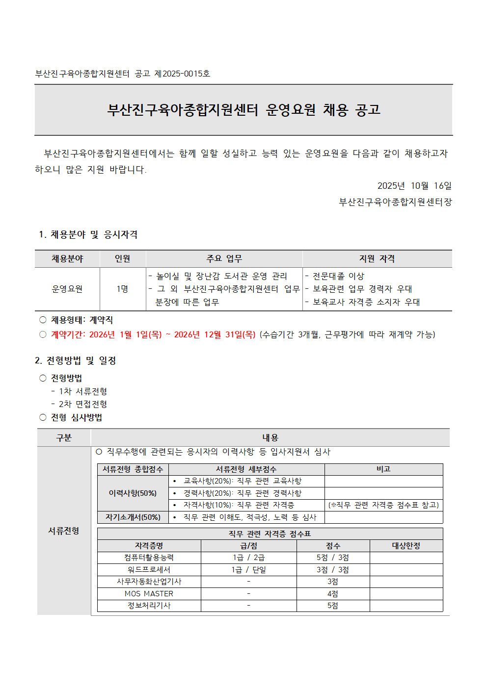 [부산서구육아종합지원센터] 직원 채용 공고