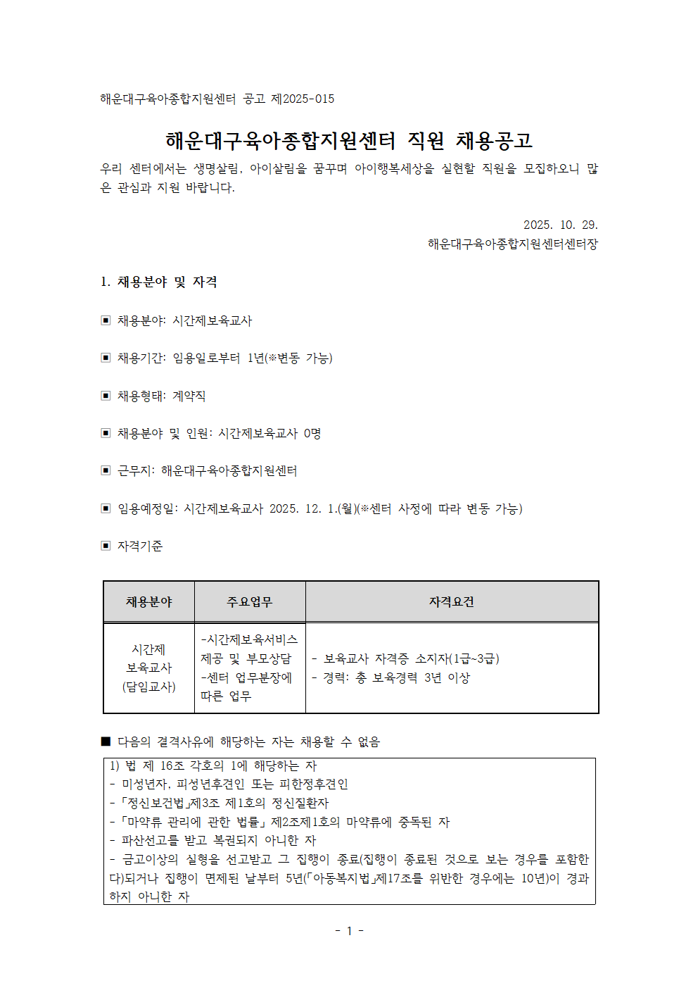 [부산동래구육아종합지원센터] 직원 채용 공고