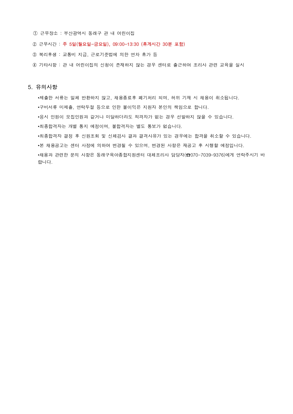 [동래구육아종합지원센터] 2026년도 대체조리사 채용 공고