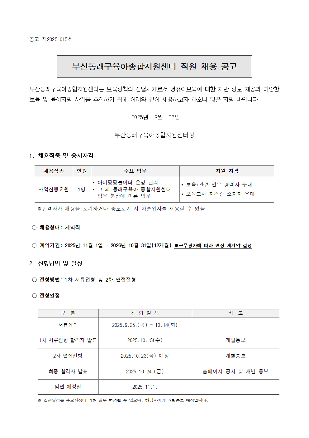 [사상구육아종합지원센터] 2025년 시간제대체교사 채용 공고