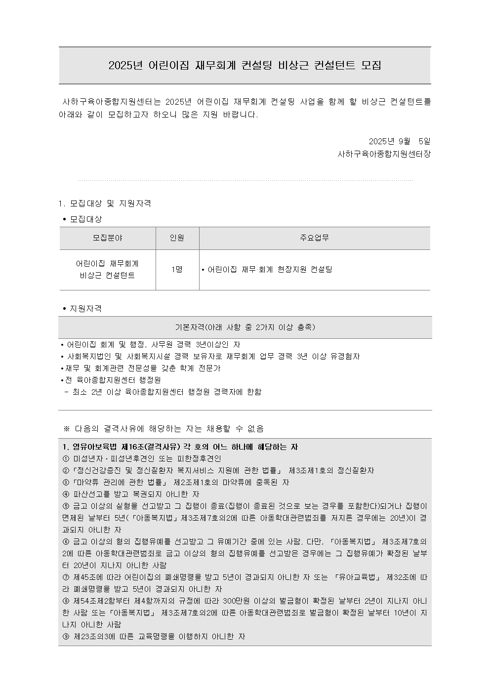 [사하구육아종합지원센터] 2025년 사하구육아종합지원센터 직원(상담전문요원, 특수교사) 채용 공고문(기간연장)