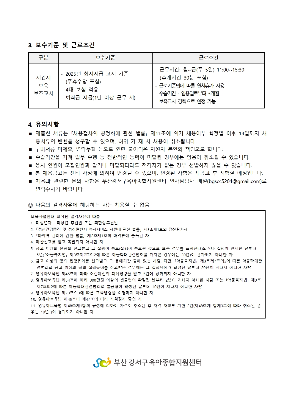 [부산강서구육아종합지원센터] - [신규직원(시간제보육 보조교) 채용 공고]