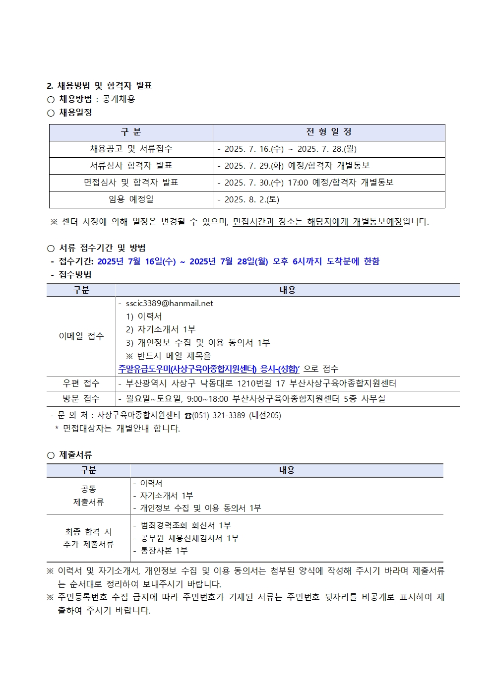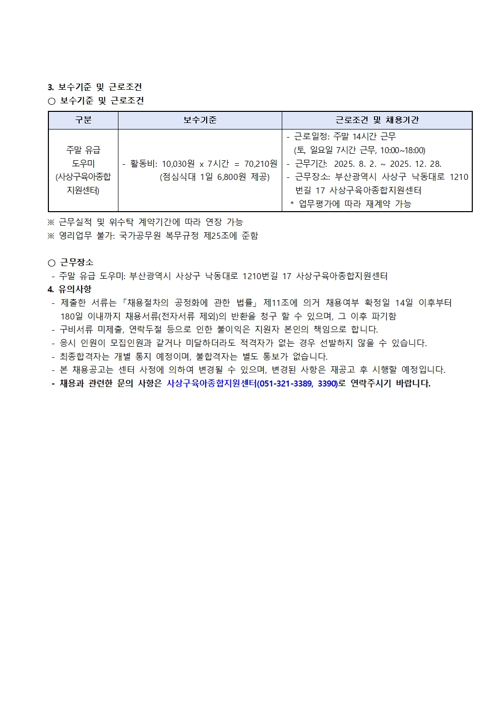 [사상구육아종합지원센터] 사상구육아종합지원센터 주말 유급 도우미 채용 재공고문