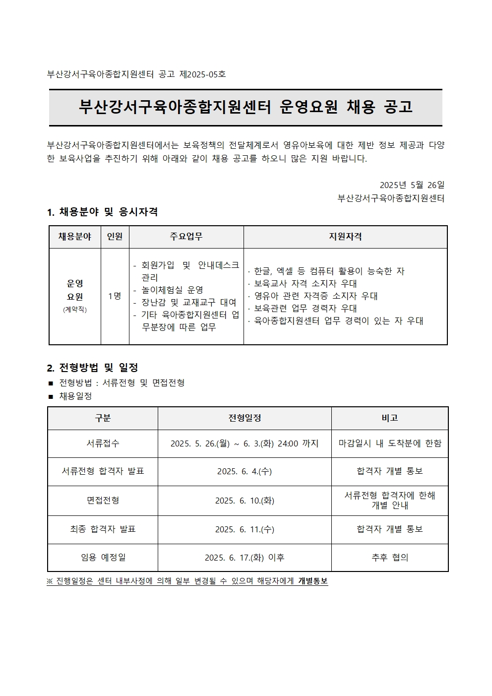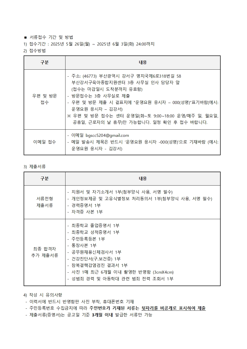 [부산강서구육아종합지원센터] - [신규직원(운영요원) 채용 공고]