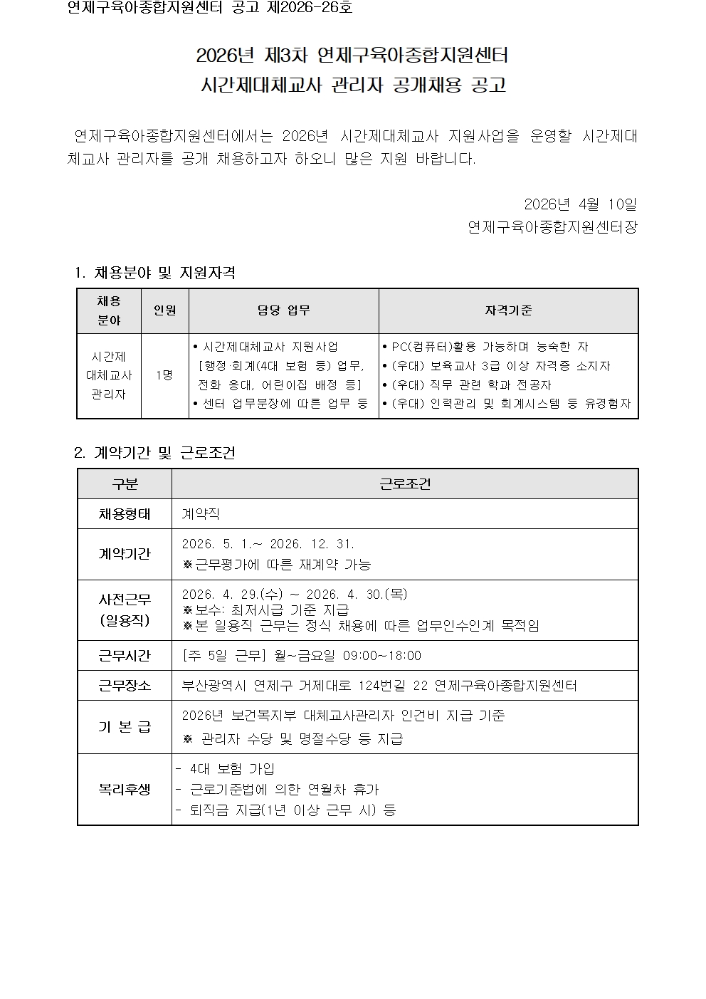 붙임1_연제구육아종합지원센터 제3차 시간제대체교사 관리자 공개채용 공고문 1부.hwp