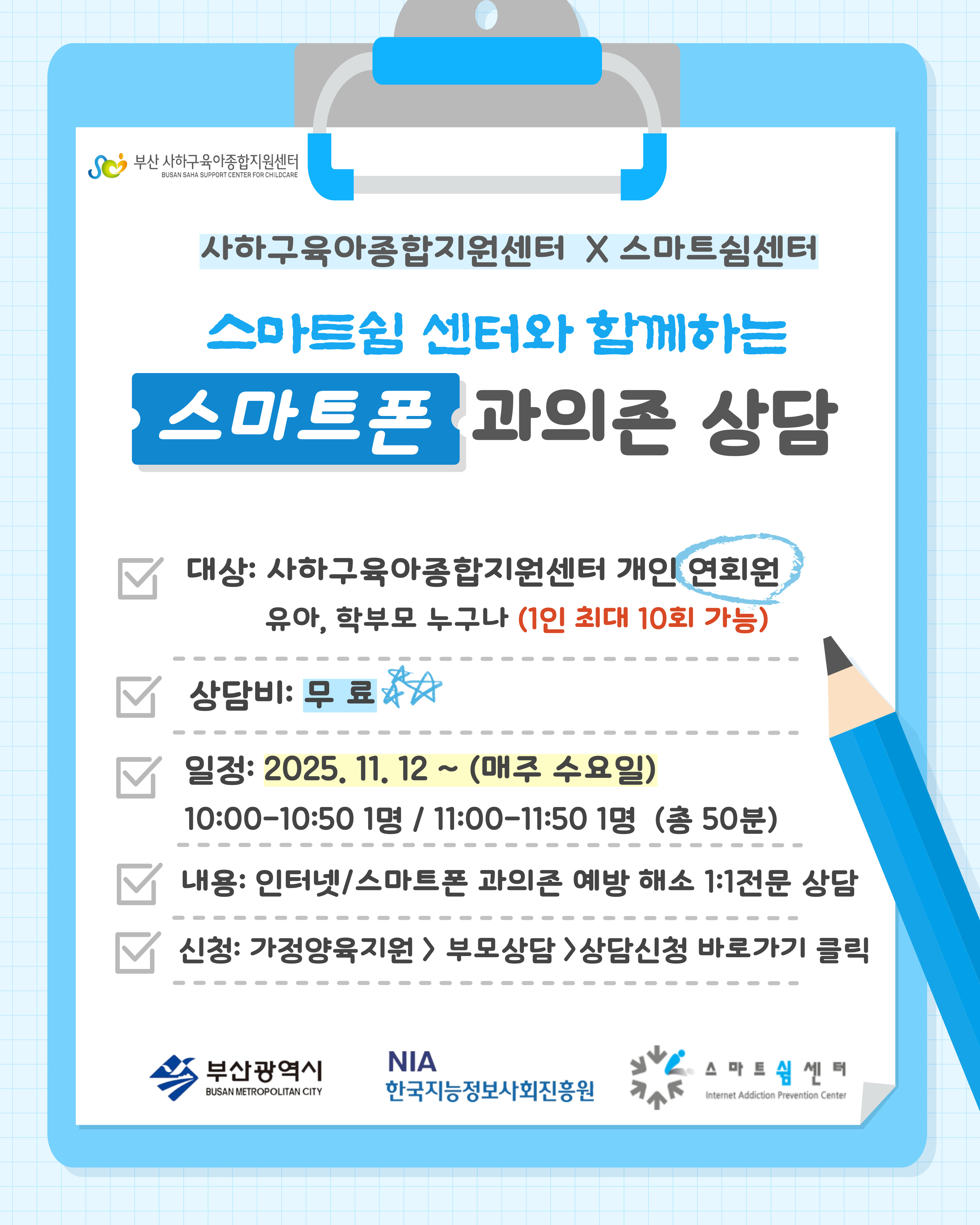 | [사하구육아종합지원센터 X 스마트쉼센터] 스마트쉼 센터와 함께하는 스마트폰 과의존 상담 | |||
