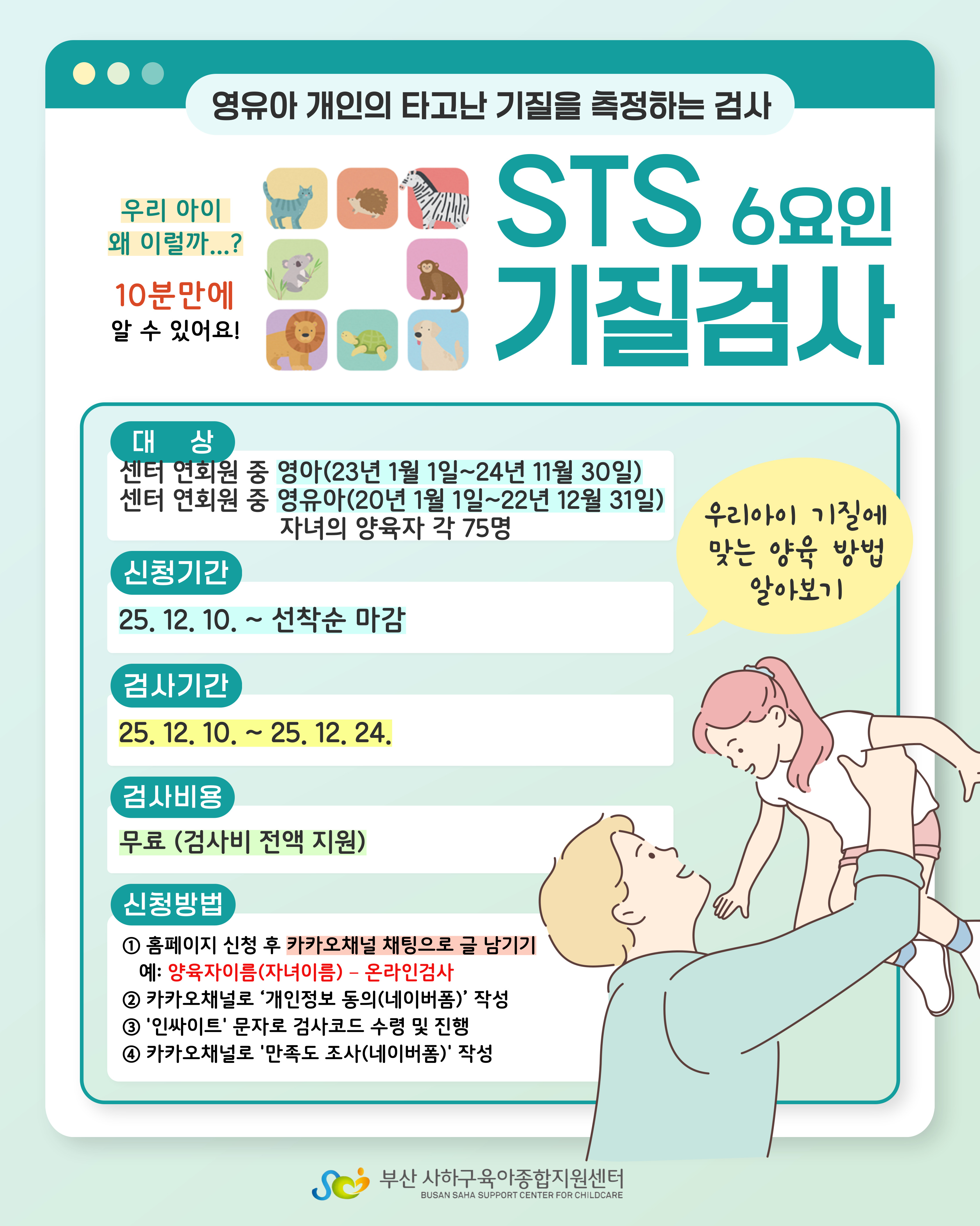[STS 6요인 기질검사]를 실시합니다. [방법] 1. 신청 홈페이지 신청 후 카카오채널 채팅으로 글 남기기 예: 양육자이름(자녀이름) – 온라인검사 2. 개인정보 동의