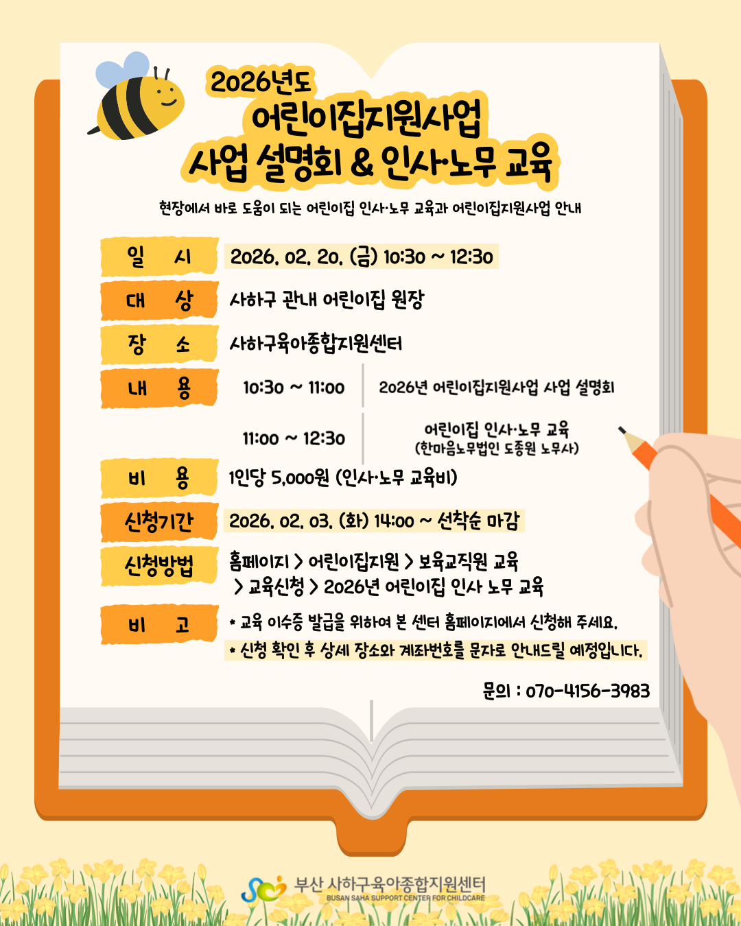 2026년 어린이집지원사업 사업설명회 및 인사·노무교육을 진행하게 되어 안내드립니다.