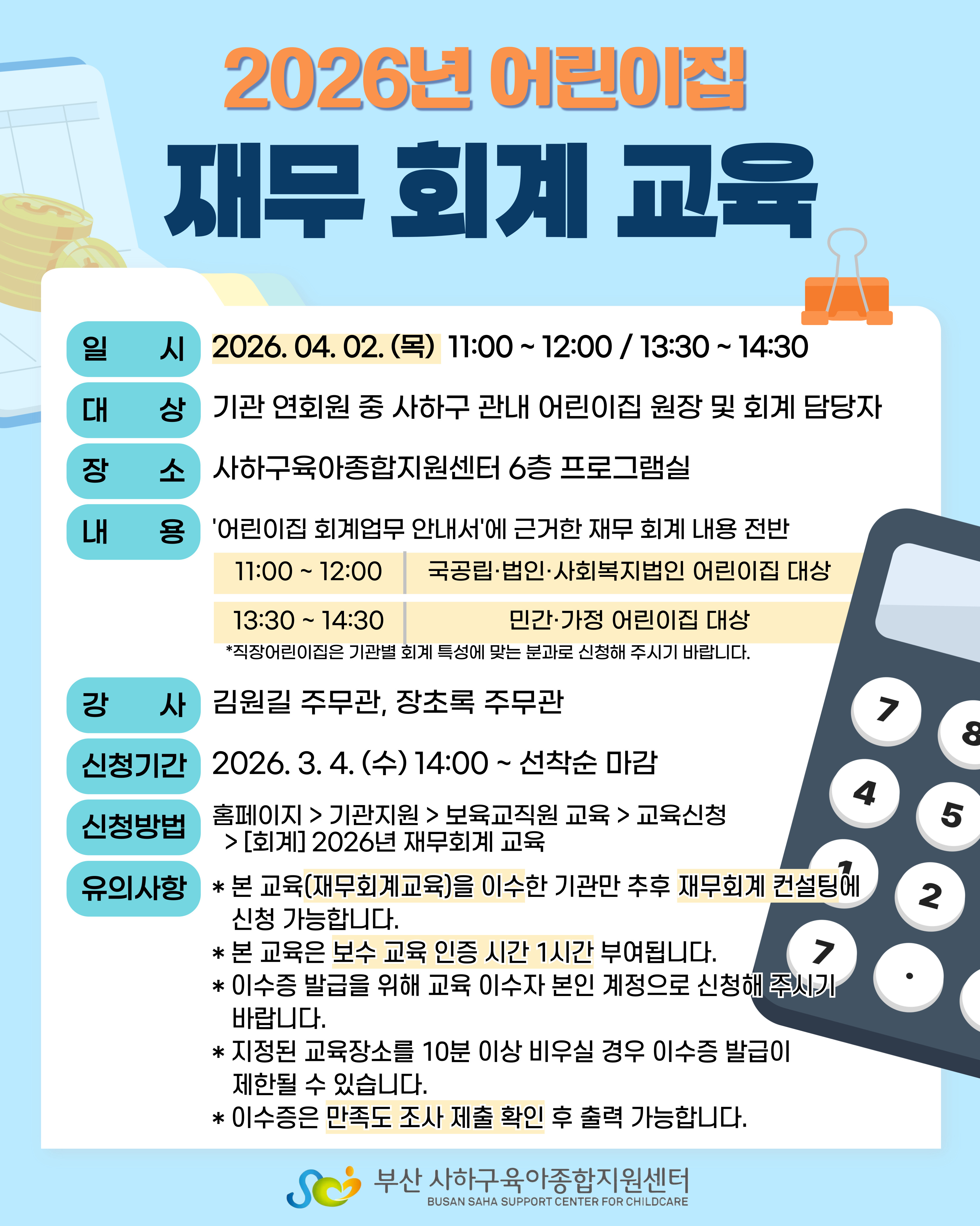 [사하구육아종합지원센터]2026년 어린이집 재무회계교육 신청 안내