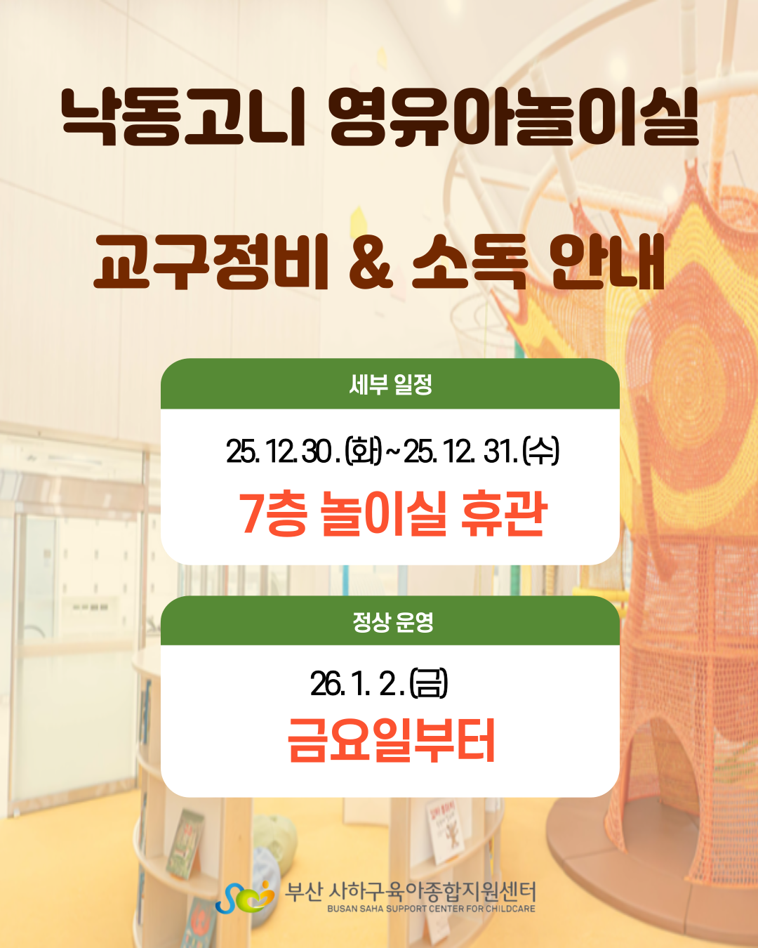 [사하구육아종합지원센터] 낙동고니 영유아놀이실 교구정비 및 소독 안내 (12/30~12/31)