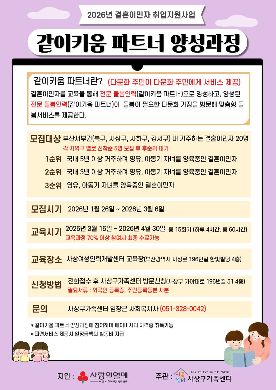 [사상구가족센터] 2026년 결혼이민자 취업지원사업 (같이키움 파트너 양성과정)