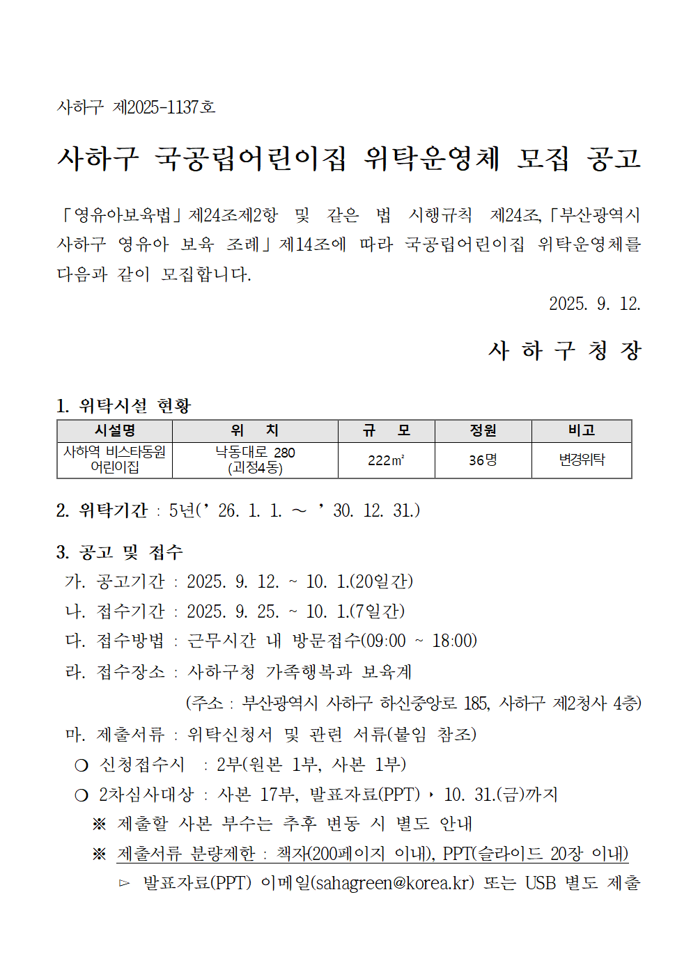「영유아보육법」제24조제2항 및 같은 법 시행규칙 제24조,「부산광역시 사하구 영유아 보육 조례」제14조에 따라