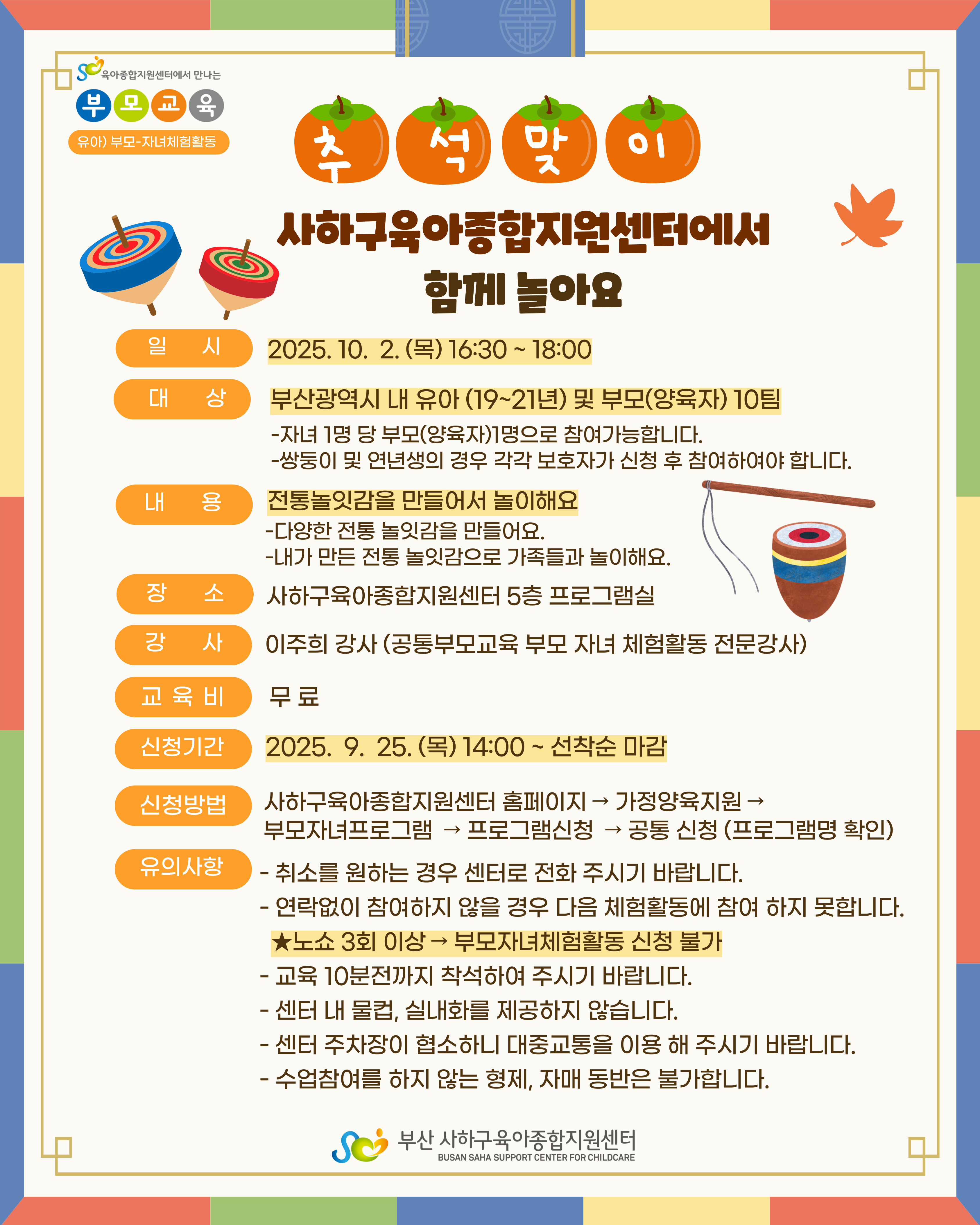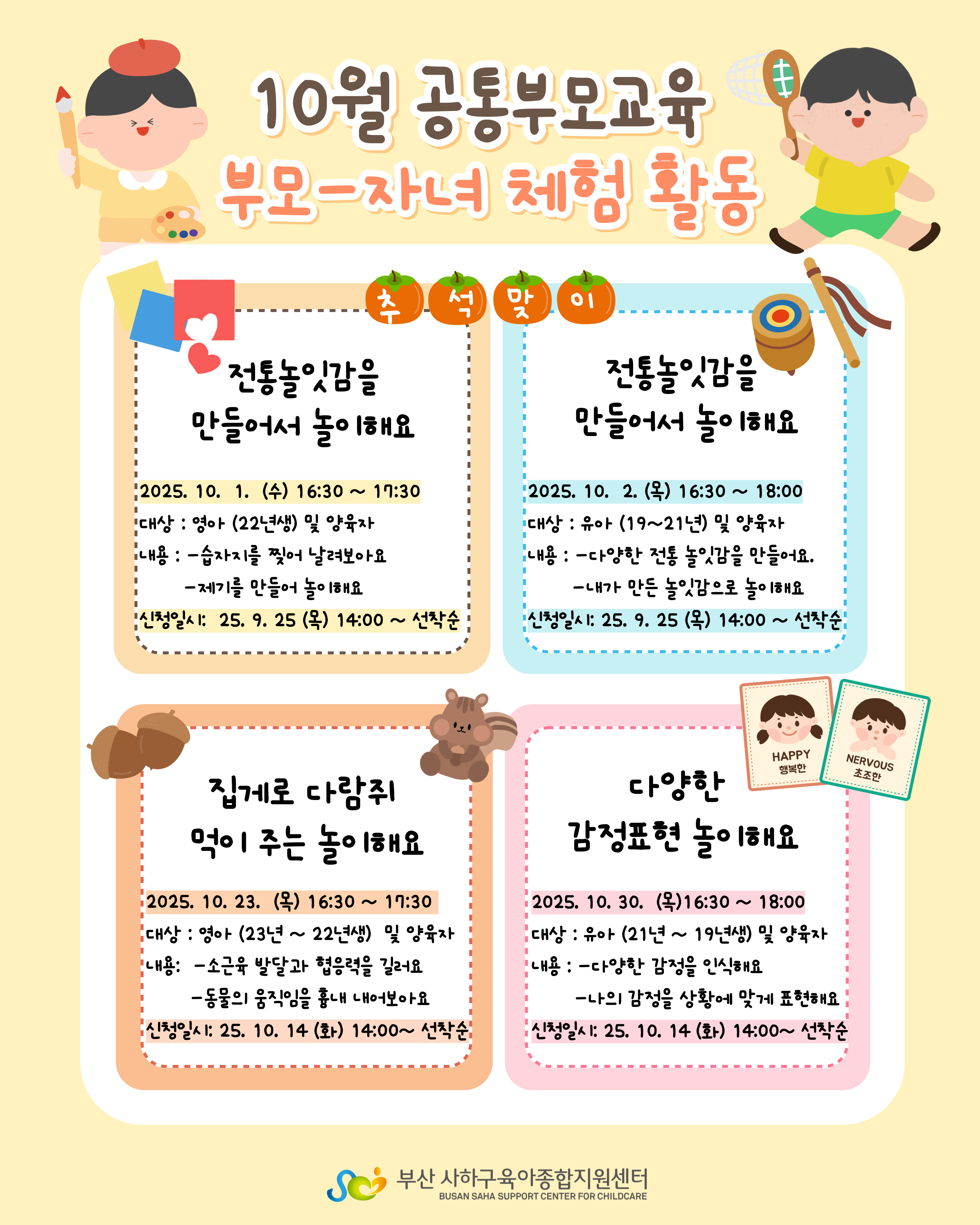 [사하구육아종합지원센터] 10월 공통 부모교육 부모-자녀 체험 활동 안내
