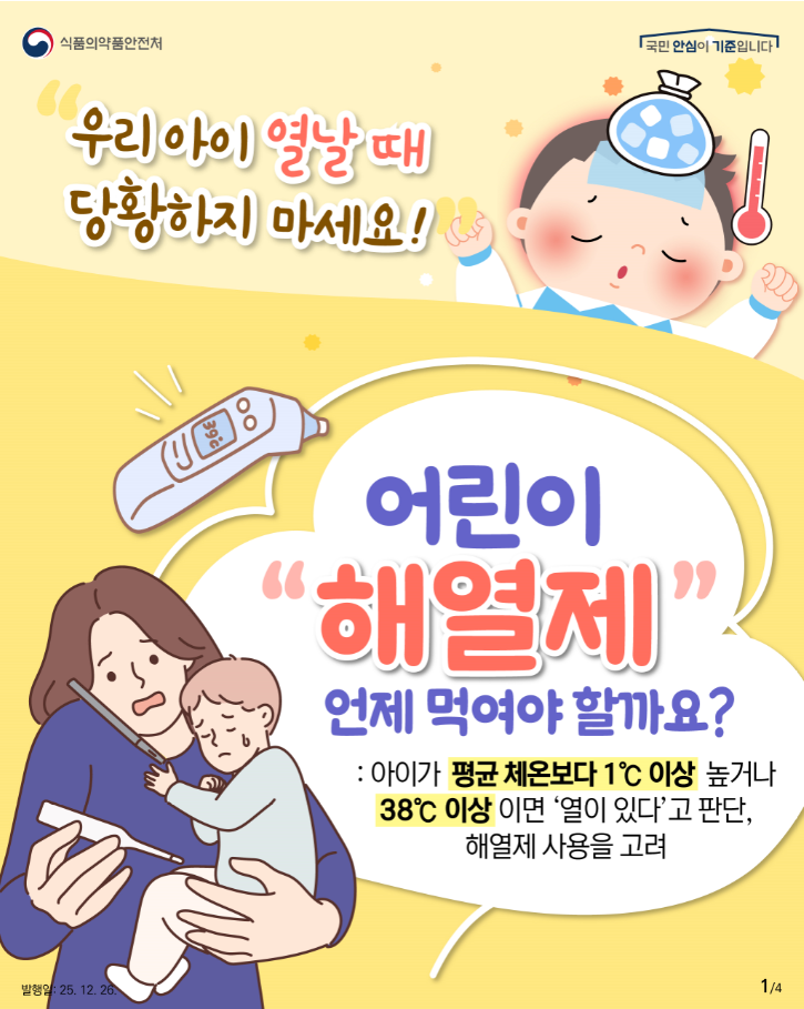 아이가 해열제를 복용한 후에도 고열이 지속되는 경우 동일한 해열제를 복용 간격 이내에 반복해서 먹이지 않도록 하고, 의사의 처방에 따라 다른 계열의 해열제를 복용 간격(2~3시간)을 지켜 사용하는 것이 좋다.