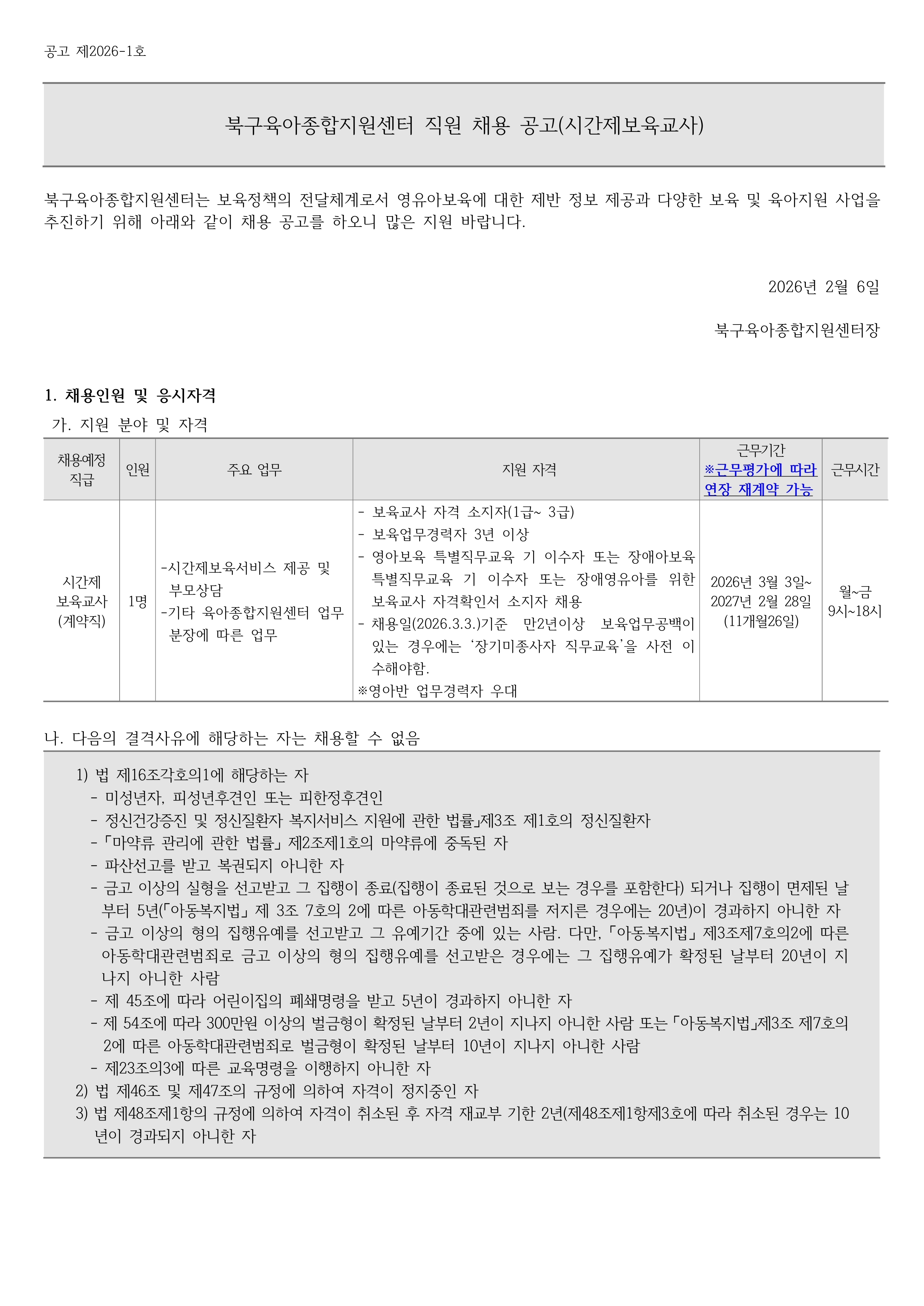 [북구육아종합지원센터] 직원 채용 공고 게시 요청(시간제보육교사)