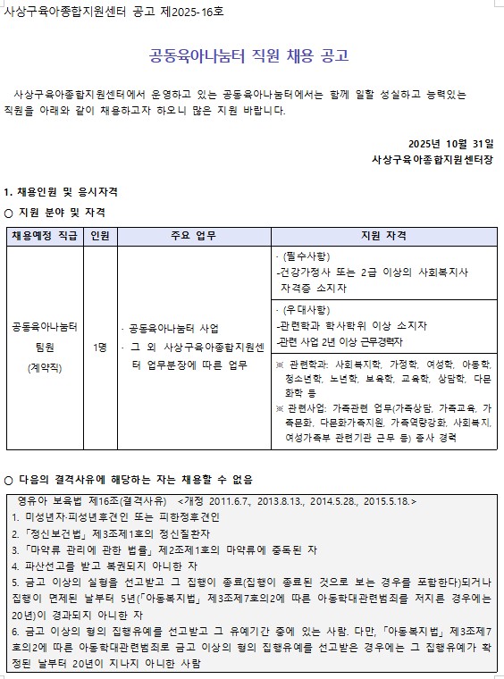 [사상구육아종합지원센터] 공동육아나눔터 직원 채용 공고