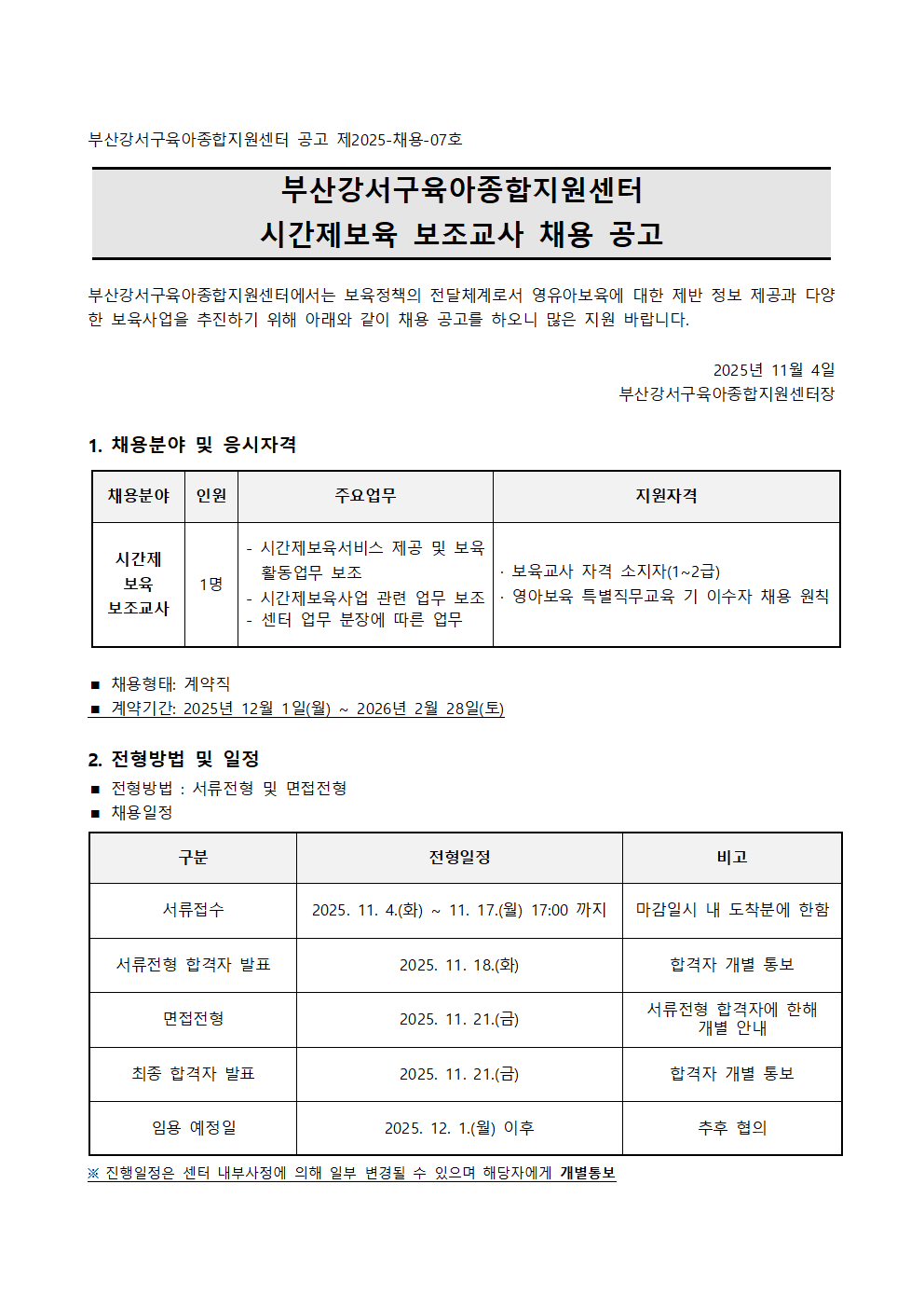 붙임 1_ 부산강서구육아종합지원센터 시간제보육 보조교사 채용 공고문.hwp