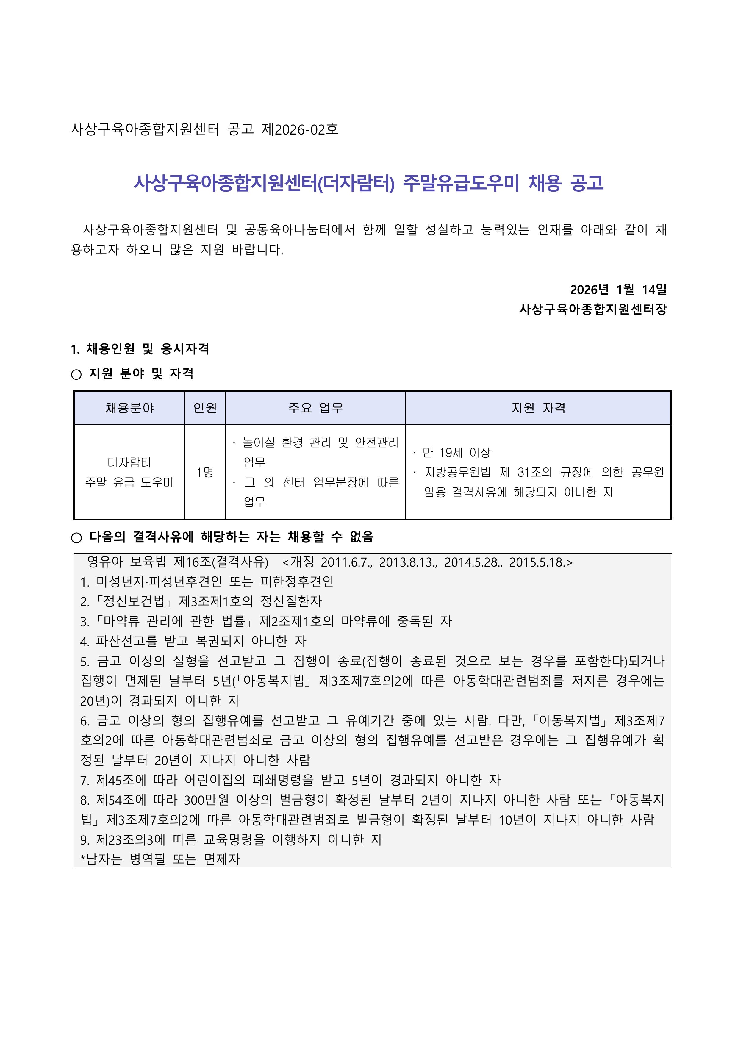 [사상구육아종합지원지원센터] (더자람터) 주말유급도우미 채용 공고