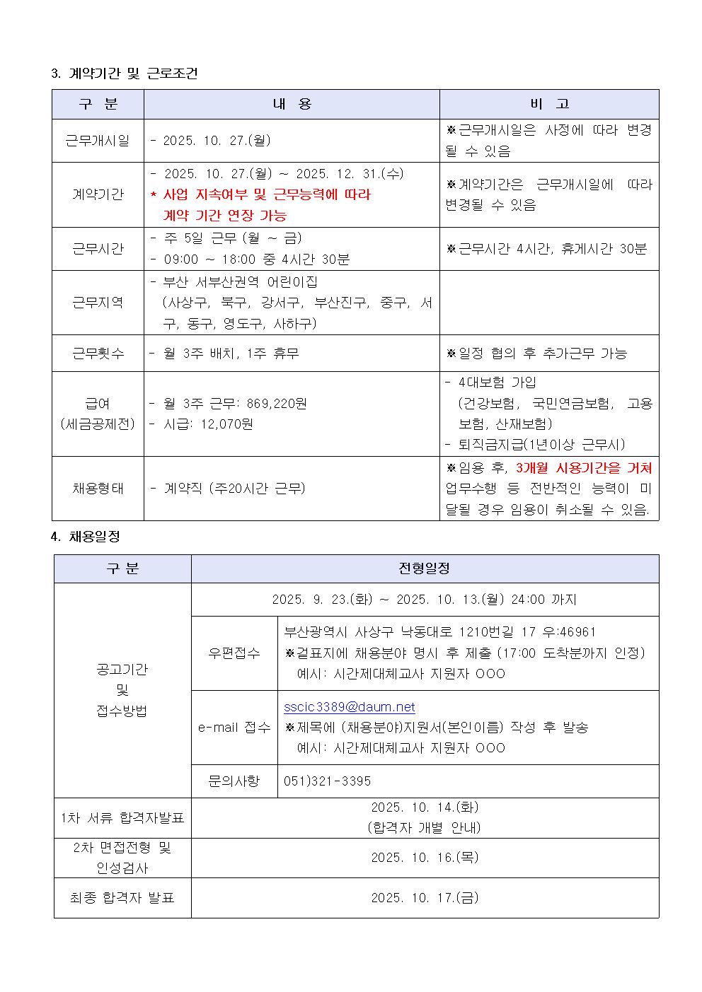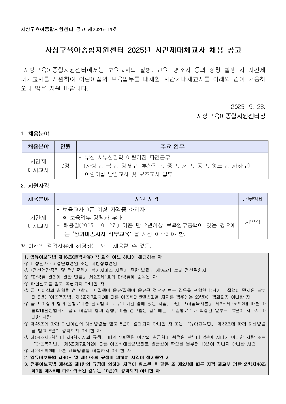 [사상구육아종합지원센터] 2025년 시간제대체교사 채용 공고