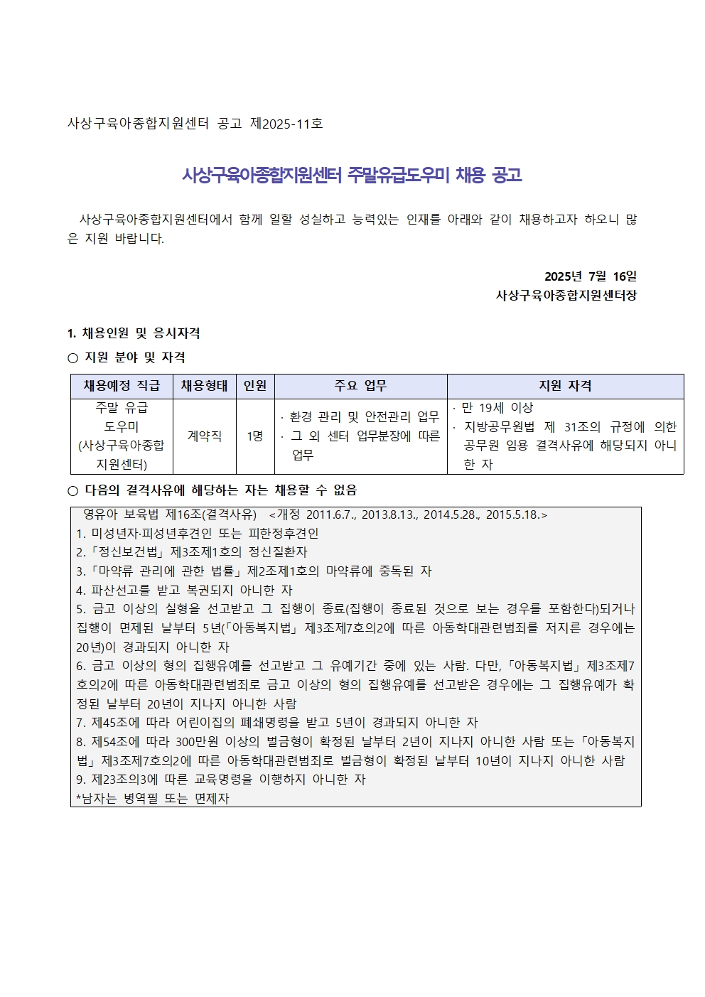 [사상구육아종합지원센터] 사상구육아종합지원센터 주말 유급 도우미 채용 재공고문